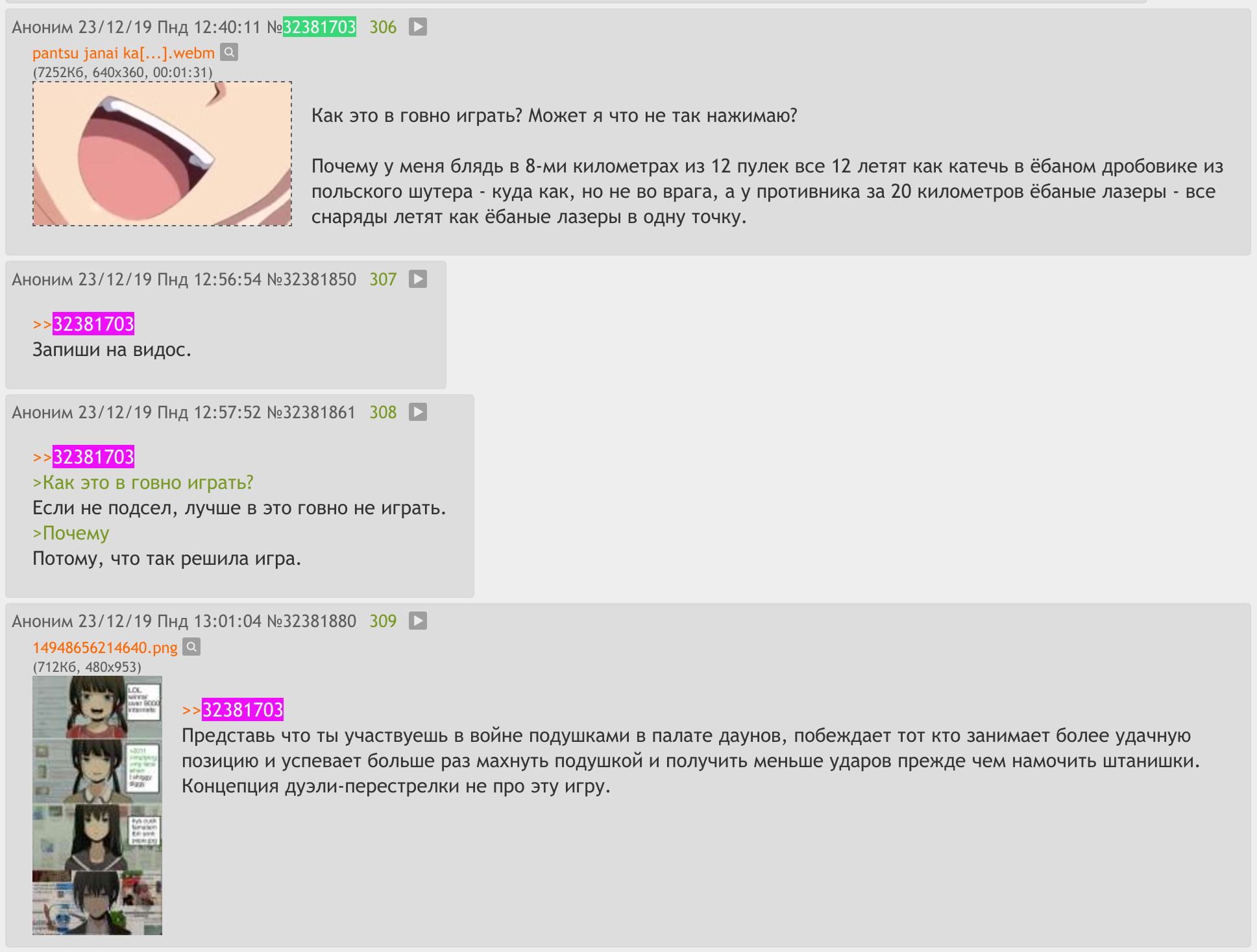 >>50679470 >>50680501 Ну вот я сегодня стоял за островком и тихонечко сбивал захват пмкшному высморку почти в упор из инвиза, жёлтыми пульками. По чужому засвету офк. Сокомандники пошли на дно на нашем фланге, остались я на буффало и треугольничек. Треугольничек лютейше начал блеймить меня, нон-стопом хуярил в чят "Отлично сыграно, юзернейм" а я просто ждал, когда мне он подсветит высморк дабы я сжёг его из-за острова, он просто стоял на точке и все 12 пулек спокойно залетали в него. А петушинец нарезал круги и спамил "Отлично сыграно, юзернейм", стрельнул несколько раз в меня. Я несколько жалоб отправил. Потом я его дожёг. Я ведь прав был в той ситуации, коллеги?
