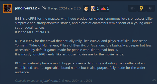 >>50567905 Тем более всё равно, скорее всего, не получится превзойти в графоне БГ3. Даже нельзя будет написать "Пошаговая CRPG с лучшей графикой в жанре!"