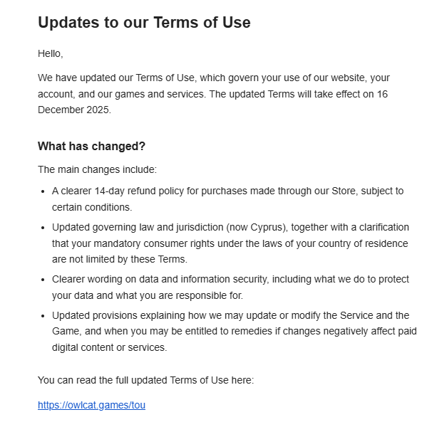 Новости: 1) Релизнулся большой патч 1.5 для РТ ребаланс, переработка колоний и еще много-много всего! 2) Первое длц для RT, с компаньоном-ассасинкой культа смерти и расширением корабля — вышло. Второе длц, с компаньоном-негром-арбитесом-пидорасом и его летающим киберпетушатником — вышло и оказалось полным калом. Третье длц про Тразина Неисчислимого и его бляцкий музей запланирован на апрель–июнь 2026 года. Четвёртое длц про космическую помойку запланировано на июль–сентябрь 2026 года. Релизный трейлер Void Shadows: https://www.youtube.com/watch?v=hsgKGORxxXc Релизный трейлер Lex Imperialis: https://www.youtube.com/watch?v=Dh9lu23PCiA 3) Owlcat представила The Expanse: Osiris Reborn, будущая Аction RPG по вселенной Экспансии. Анонсирующий трейлер: https://www.youtube.com/watch?v=pIQifuOTTe8 4) В разработке следующая игра совокотов по вселенной Warhammer 40000 - Dark Heresy. Анонсирующий трейлер: https://www.youtube.com/watch?v=mmfu_Spm-6U Грядущий альфа-тест: https://darkheresy.owlcat.games/news/ru/8 5) Патч 2.5 для ВОТР с реворком мифика Золотого дракона вышел, заодно появилась GOTY версия со всеми контентными дополнениями. Это последнее добавление контента в игру. Кто ждал финального релиза - это он.