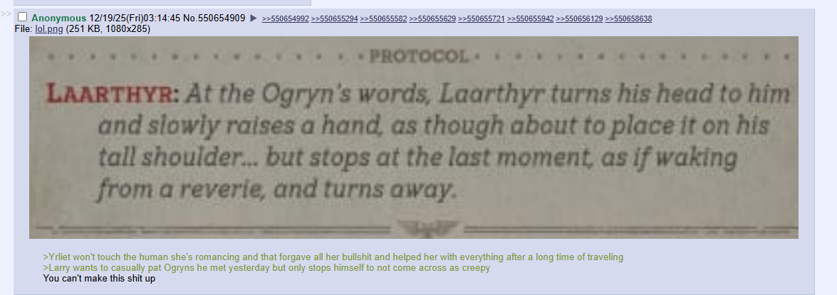 >>50577992 >Не, ну это уже ПЕРЕБОР. Пчел, у тебя в РТ высокопоставленный темный эльдар становился добровольным рабом для человеческой женщины-хаосита, влюблялся в неё и все такое.