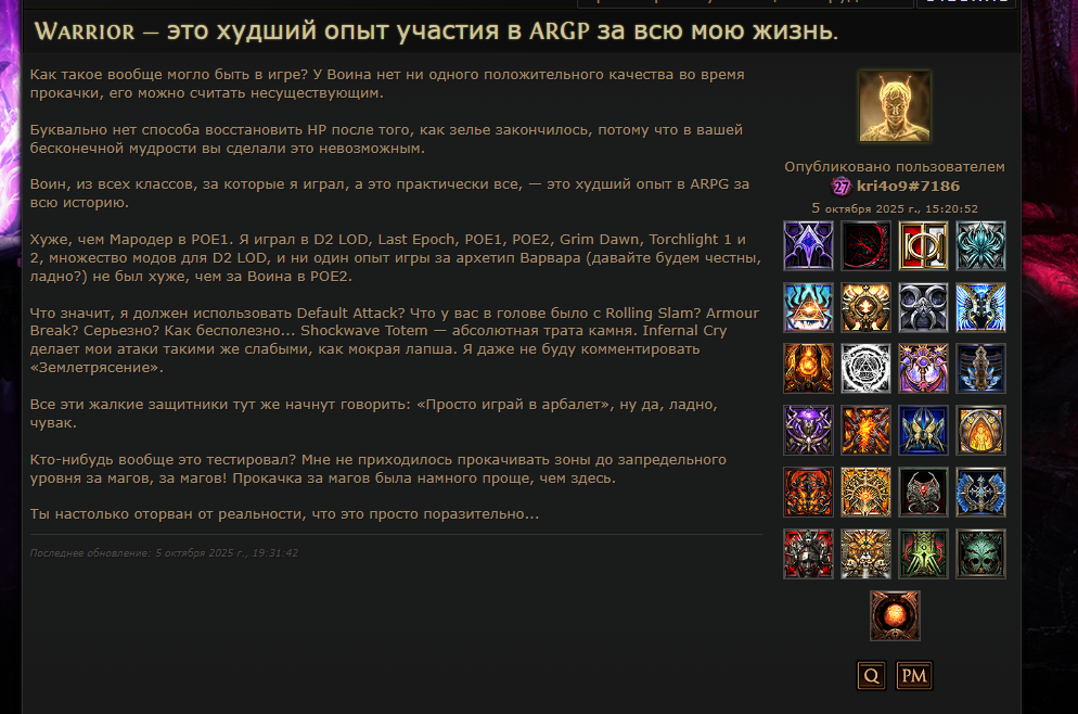 >>50570592 Разбираются в игре. Другие - это не одни и те же челы, а тонна людей с разными проблемами. Кто-то просто нытики, кто-то и не стартовал, кто-то любит похаить ГГГ, кто-то новичок, кто-то просто плохо в игре разобрался, кто-то стартанул на дерьме, либо на билде для которого нужен дорогой шмот.