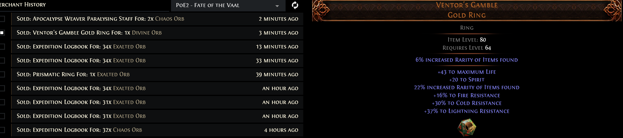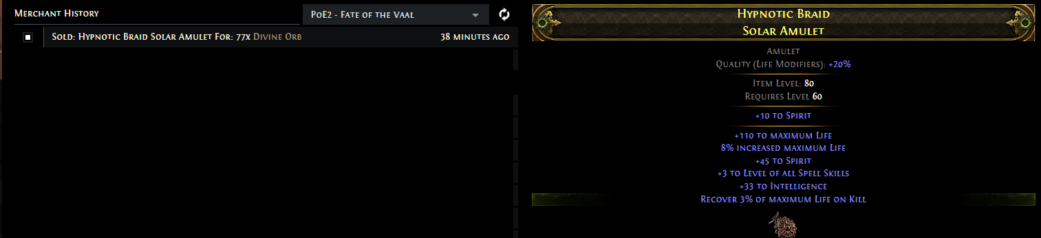 >>50581475 Ну я с пола поднял 4, а докидыванием сферок, эссенций и косточек в выбитые с пола базы примерно вот столько. Эт я еще проебался, выставил топ шмотку на продажу за 39 дивайнов т.к. за 40-45 было несколько похожих, ее купили через пару минут. Я один стат оценил как мусорный и не брал его в расчет стоимости, а оказалось что он наоборот ценится т.к. через него билд придумали