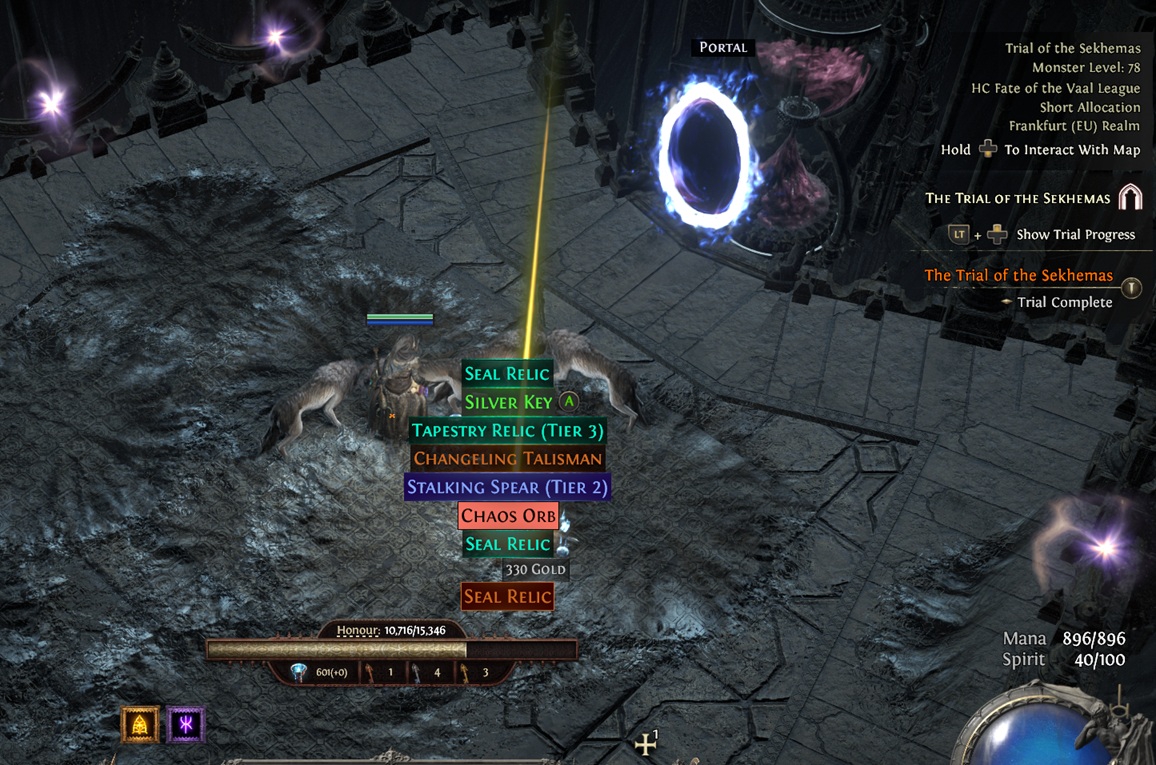 если прошел, у тя остаются шмотки, но в них валюту кидать нельзя + тебе отсыпают стак трансмуток, стак огменток, три экза и один квестовый грейтер ювелир (на 4 сокет) который можно только самому заюзать - но это только в том случае если у тебя сташ пустой и других чаров нет, если есть - появляешься голый