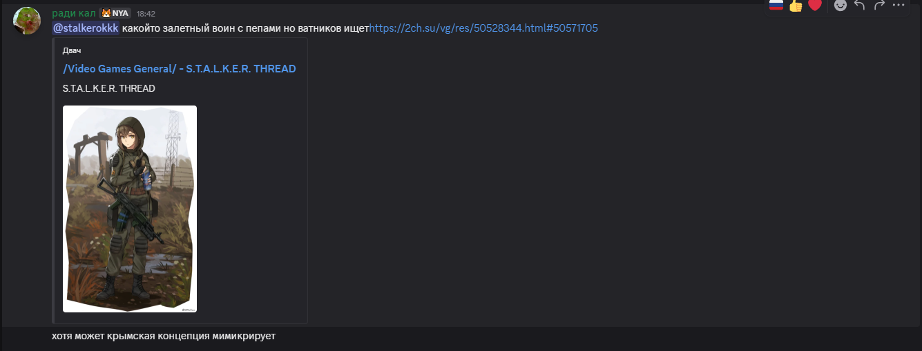Напоминаю, что тред сталкера на сосаче состоит из: Григаплотей - постоянно кидаются на любую критику сталкера 2 им. жени хрюкоровича(становятся едой буквально для всех, да и вообще их забыли спросить). Бюреров-храуфагов - сидят в своих немытых подвальчиках, кидаясь говном во всех, кто решает отойди от канонов(их шизофазии, которая каждый раз меняется) по оригинальной трилогии, особый бугурт на с2 по многим причинам, объективным и/или нет(чаще нет). Билдозомби - стёрли свои 3см приборы на дрочке билдов, пытаясь найти суть ТСС(её нет, или есть?). Полтергейсты-отрицалы - пикируются с бюрерами, им не нравится всё, что есть в с2, но ничего не делают, чтобы показать как надо по их мнению(которое как жопа, есть у каждого). Новопыс-отмычек - вкатились во время с2, особо мягкие становятся едой для первых 4х категорий, когда высказывают хоть что либо, что им не нравится Чады-сталкеры-ветераны - ржут с мутантской пиздобратии и идут дальше, или подкармивают фауну, когда тред загибается.