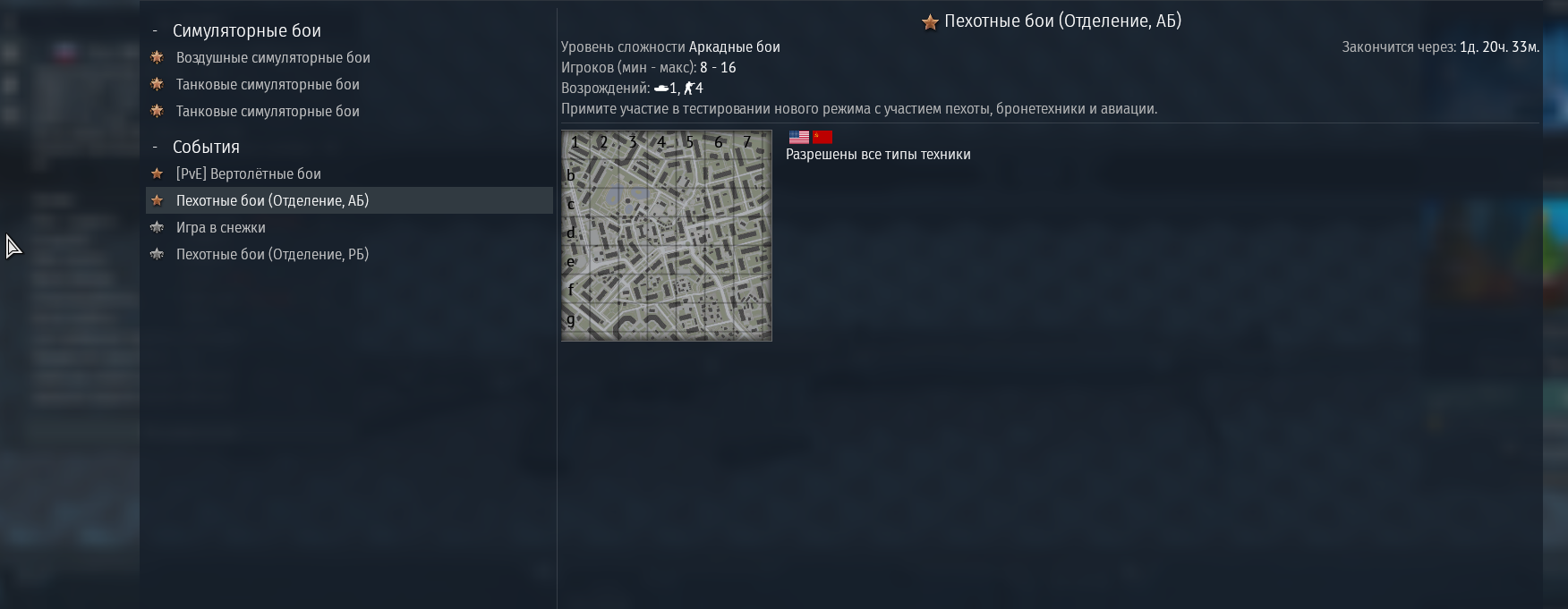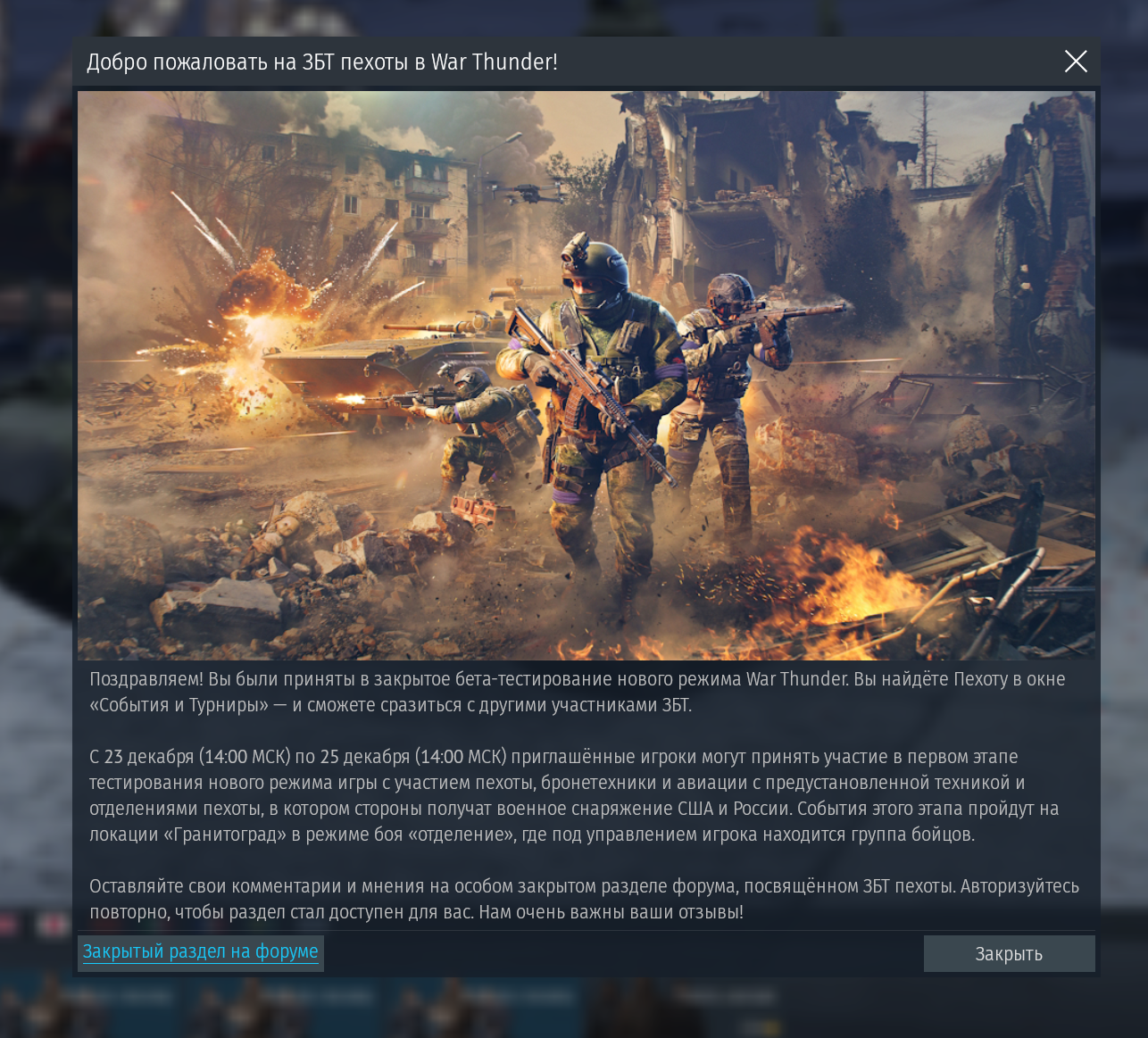 >>50596553 >С 24 декабря (12:00 МСК) по 26 декабря (12:00 МСК) приглашённые игроки могут принять участие в первом этапе тестирования нового режима игры с участием пехоты, бронетехники и авиации с предустановленной техникой и отделениями пехоты, в котором стороны получат военное снаряжение США и России. События этого этапа пройдут на локации «Гранитоград» в режиме боя «отделение», где под управлением игрока находится группа бойцов.
