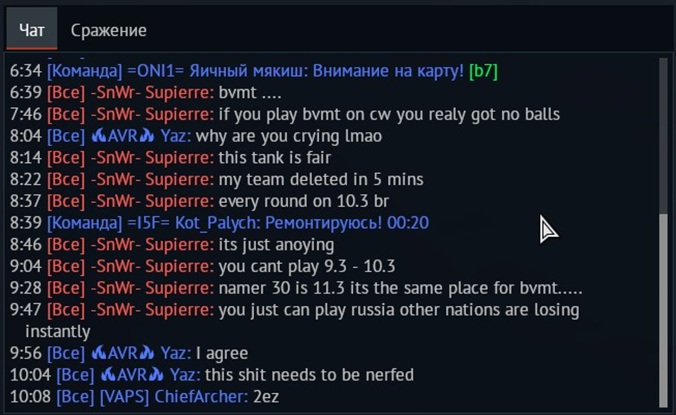 >играешь на личный результат >мовес >37% побед >КВ 7 >вся команда померла 3 минуты назад точке С один он отстреливается МАМ СМАРИ Я КИБЕРСПОРТСМЕН МАМ