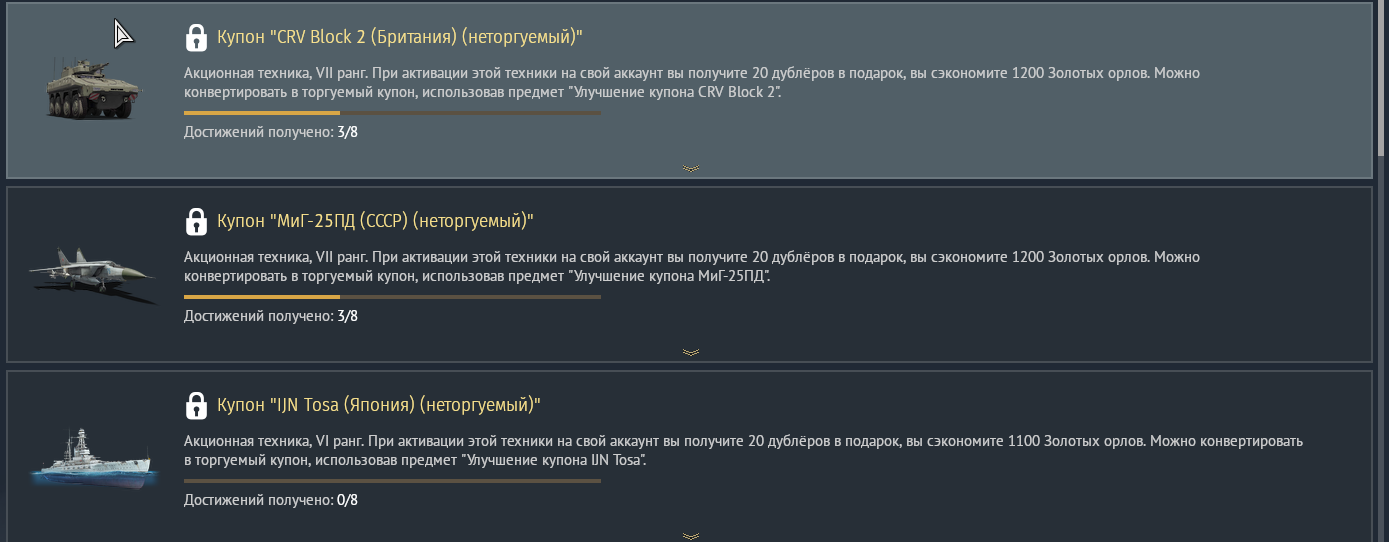 >>50596769 > В чём смысл дорогих пакетиков, если это аналоги прокачиваемой техники? 1) В коэффициентах заработка очков исследования/серебра 2) Они продаются в "топовой комплектации", на линейной технике нужно прокачивать модули и страдать 3) Можно купить пакетик большого уровня и скипнуть мелкие левелы, если они тебе не интересны 4) Жидя очень любит кокс, а на одних только премах много не заработаешь