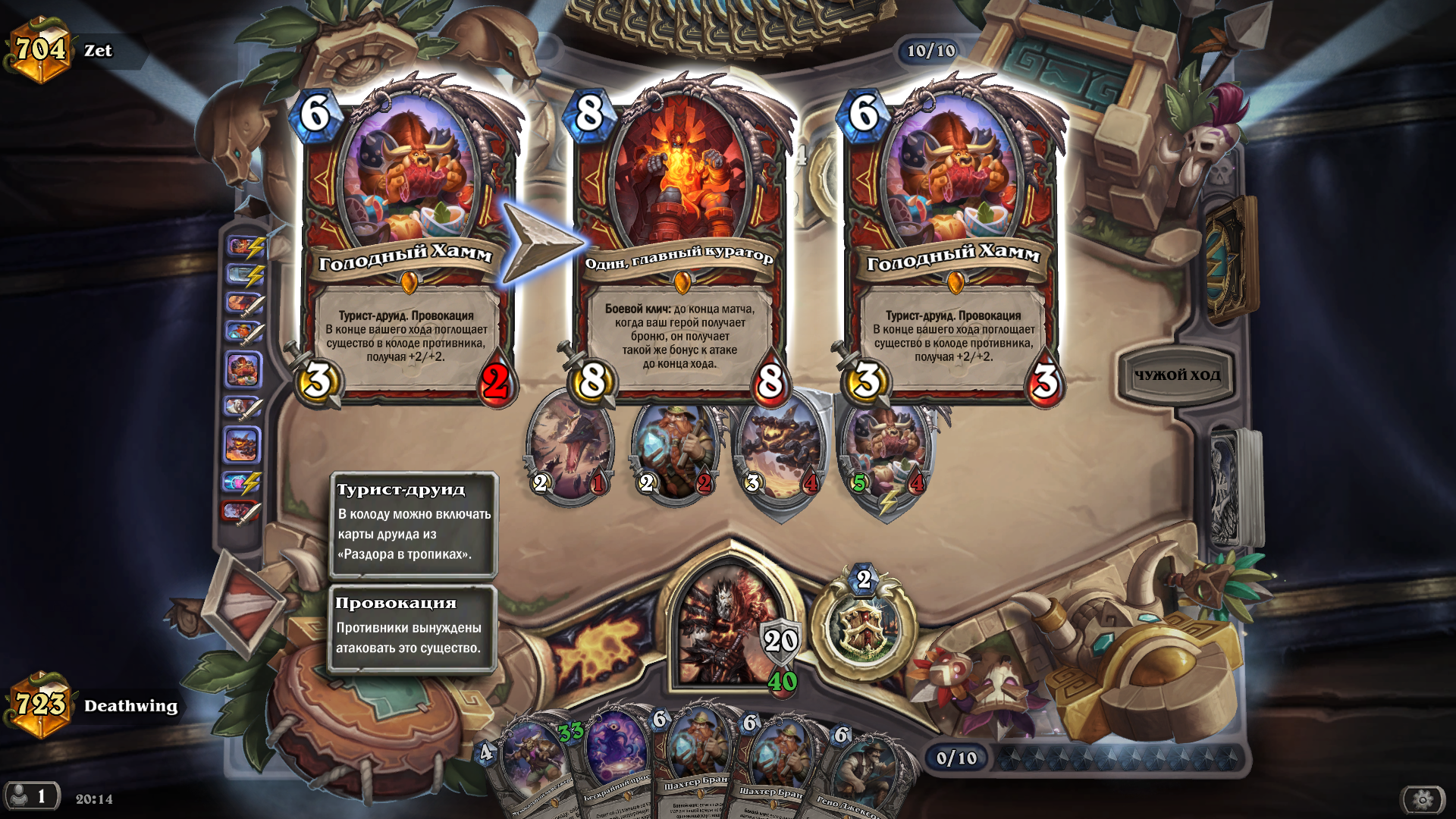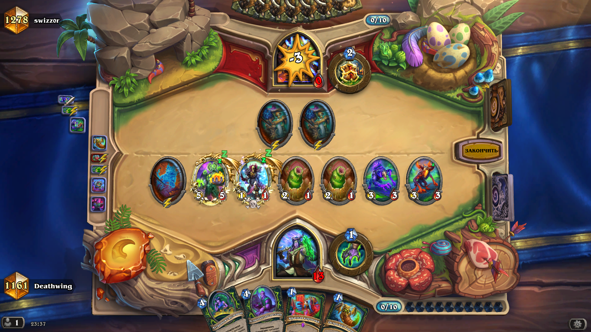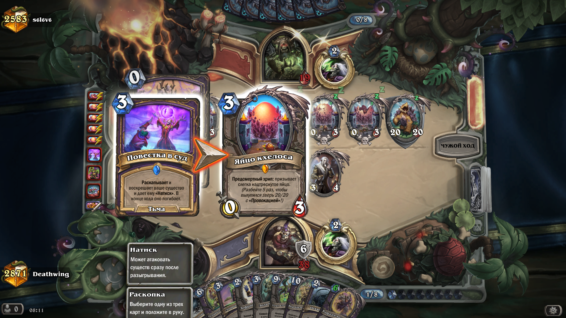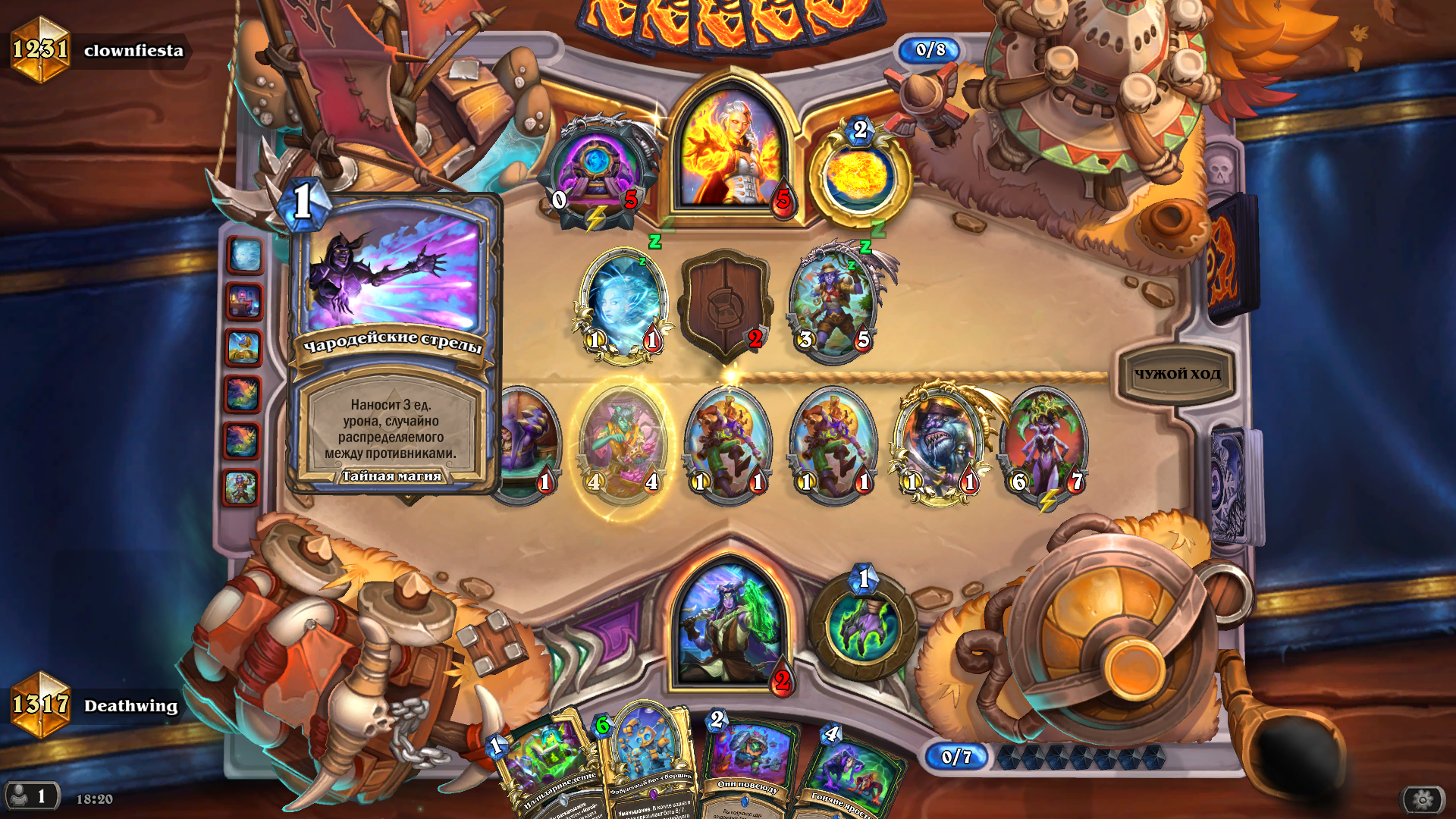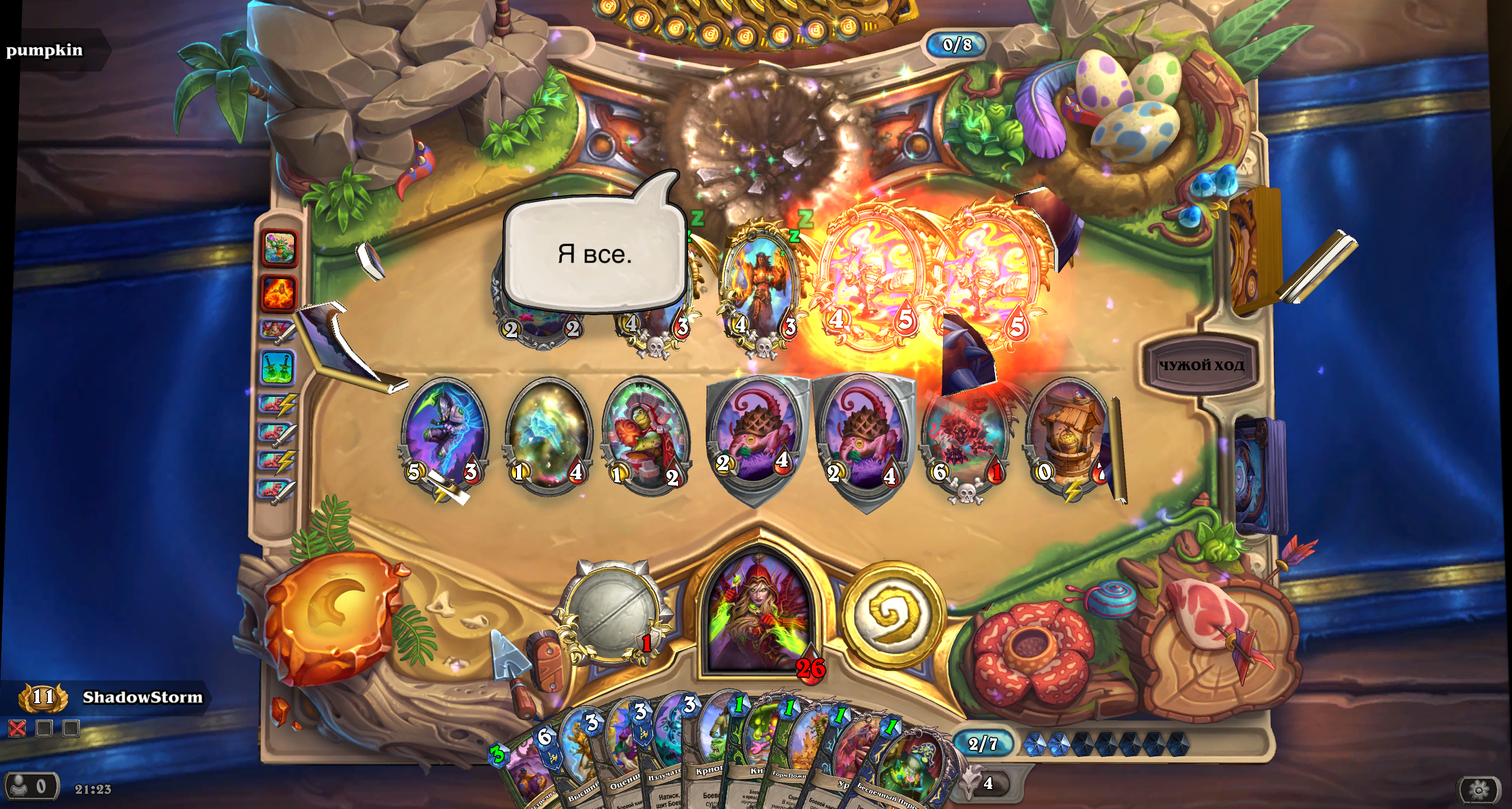 сегодня проклятие с аккаунта сняли, сыграл шесть игр, победил во всех, скилл появился, походу, вчера не было, а теперь вот он, научился побеждать, смешно одна игра, кстати, очень хуево начиналась, играю миррор, у чела вся ранняя игра как по заказу, у меня в руке кал, ни одной карты дешевле 4 маны, сижу обтекаю, только на четвертом ходу смог поставить дракошу 6\9, так дебич вместо того, чтоб своей созданной доской меня добивать, решил нахуй потрейдиться в него тупа всем столом и обнулил своё раннее преимущество, а потом у него карты кончились, а я начал своими дорогими его щемить и победил вот такие дела пик из другой игры, это просто душение ханта, у которого никаких ответов ни на что не было, огреб со старта