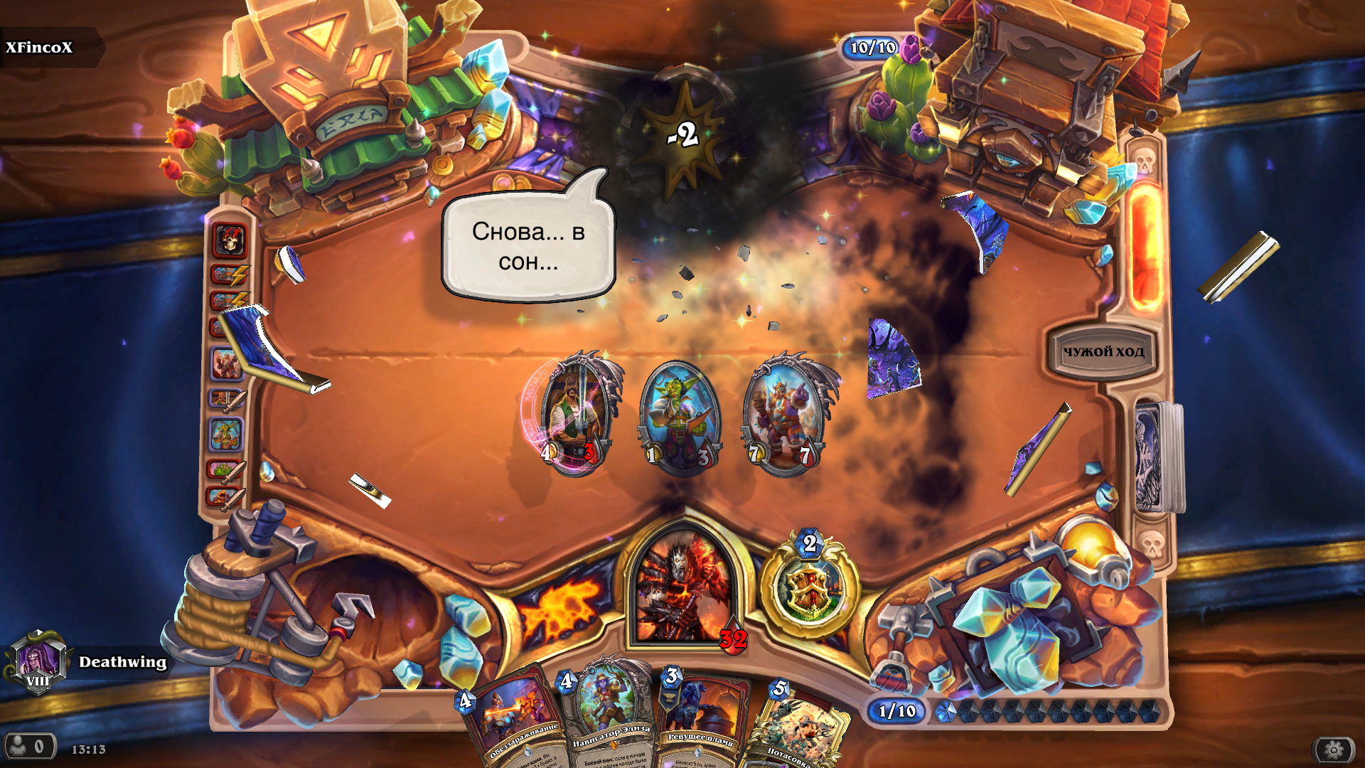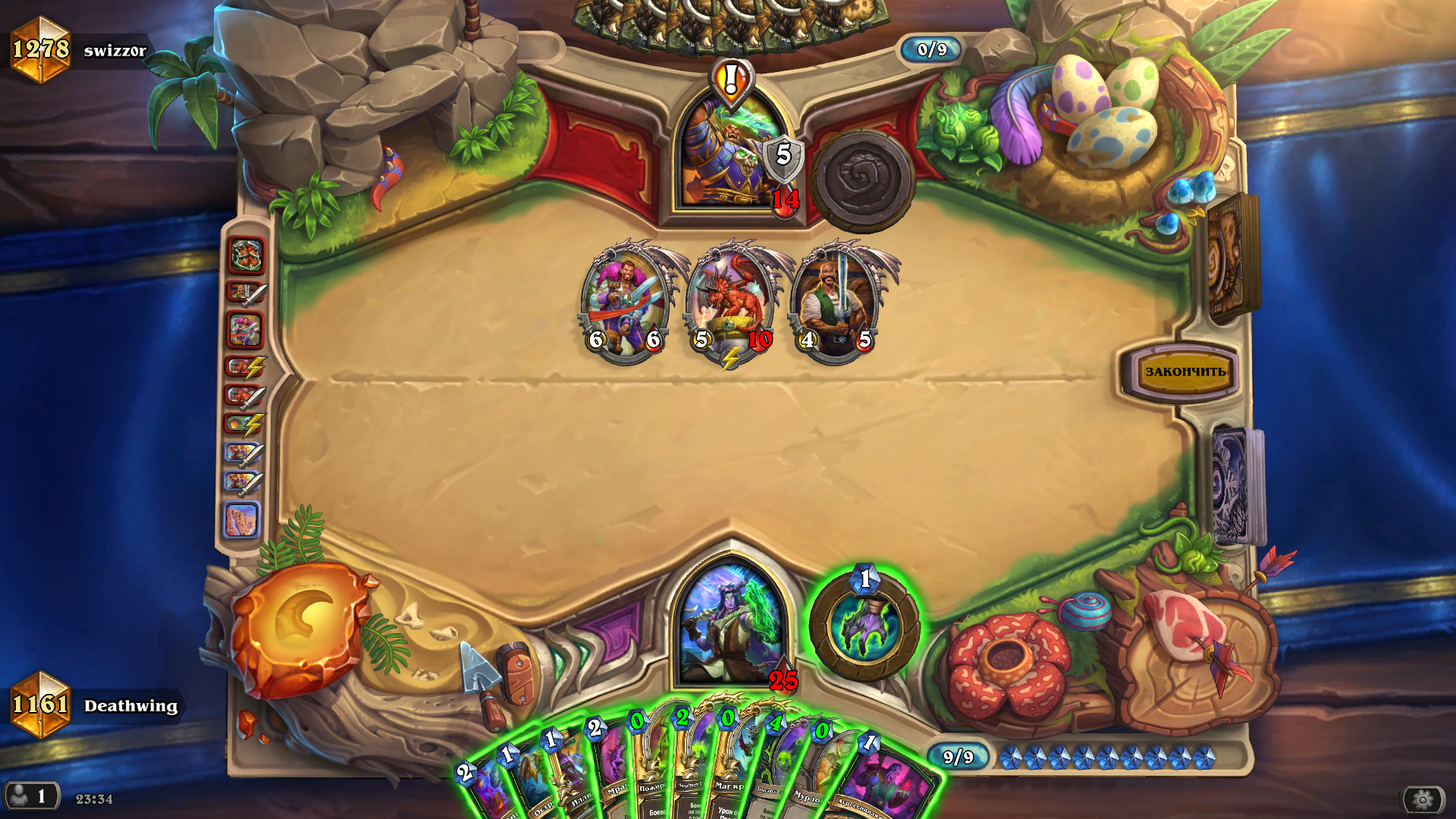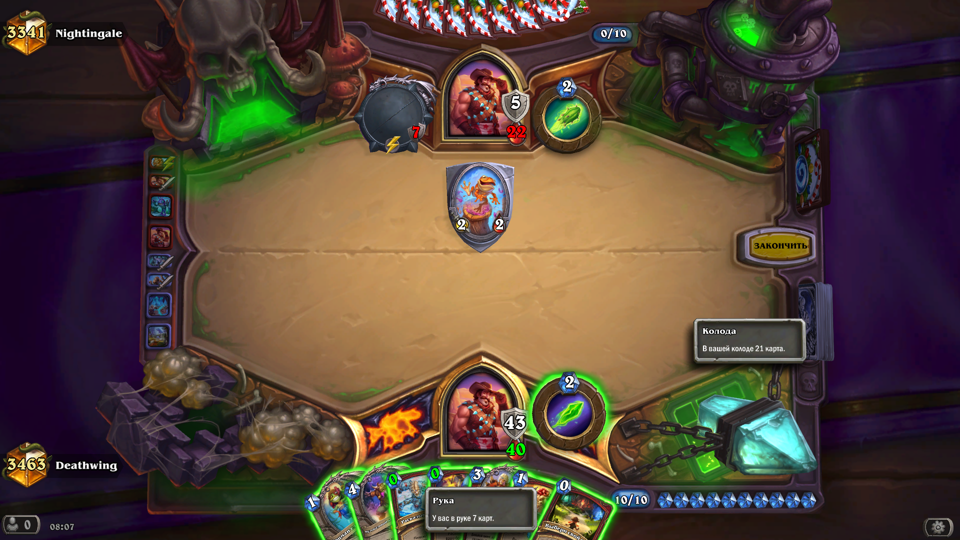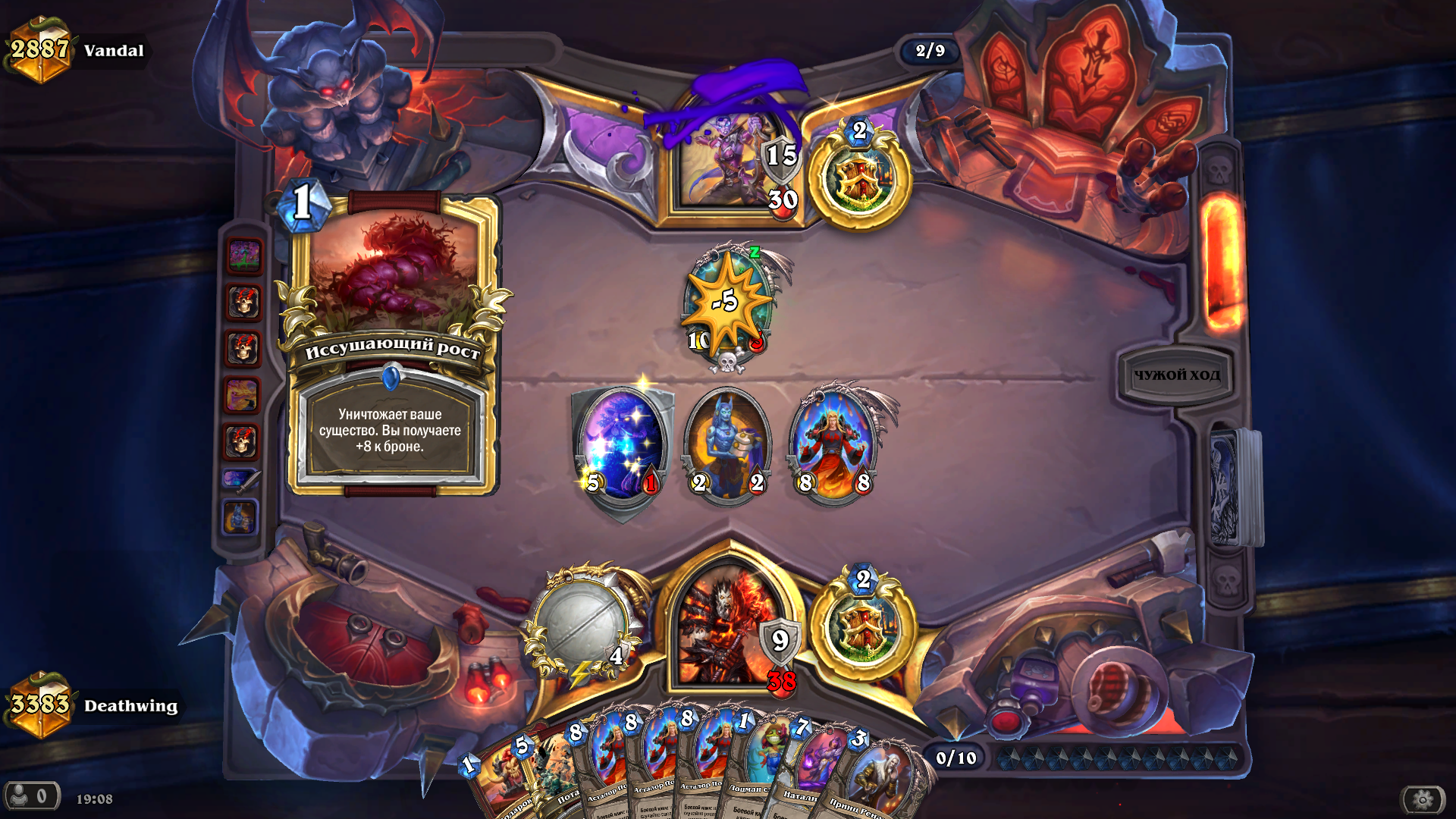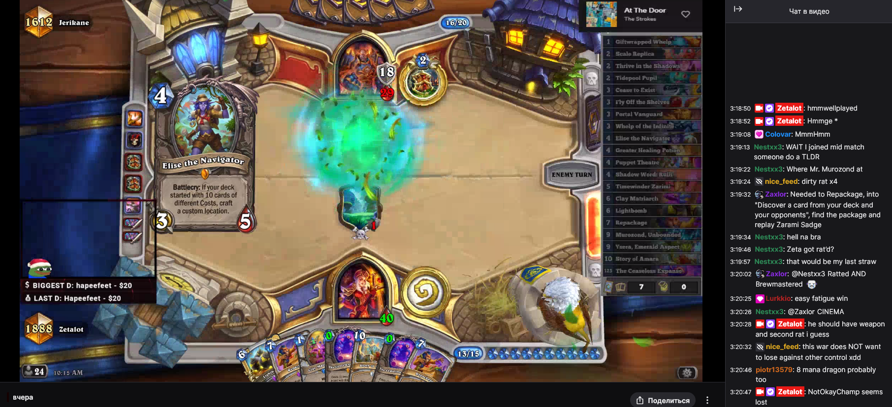 сегодня проклятие с аккаунта сняли, сыграл шесть игр, победил во всех, скилл появился, походу, вчера не было, а теперь вот он, научился побеждать, смешно одна игра, кстати, очень хуево начиналась, играю миррор, у чела вся ранняя игра как по заказу, у меня в руке кал, ни одной карты дешевле 4 маны, сижу обтекаю, только на четвертом ходу смог поставить дракошу 6\9, так дебич вместо того, чтоб своей созданной доской меня добивать, решил нахуй потрейдиться в него тупа всем столом и обнулил своё раннее преимущество, а потом у него карты кончились, а я начал своими дорогими его щемить и победил вот такие дела пик из другой игры, это просто душение ханта, у которого никаких ответов ни на что не было, огреб со старта