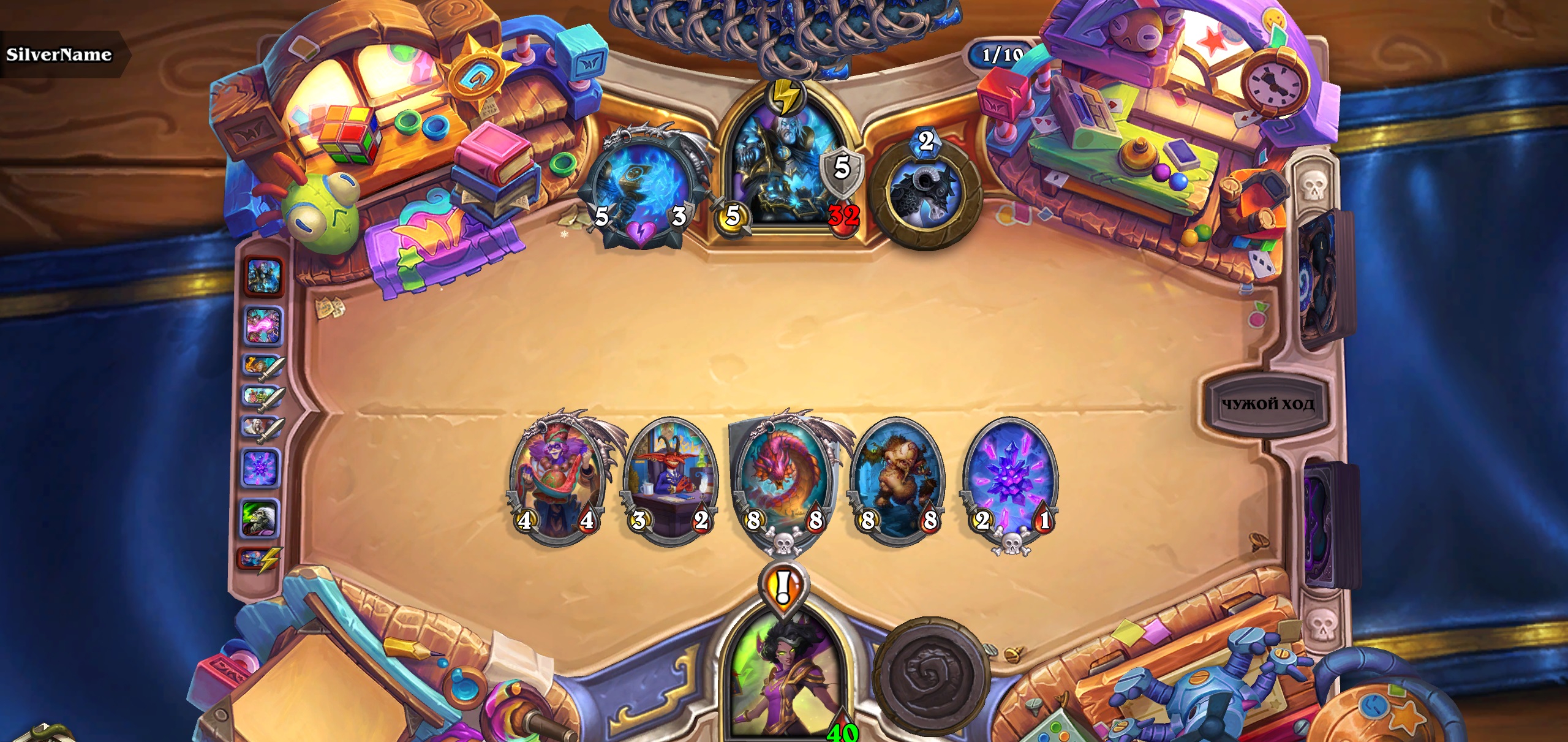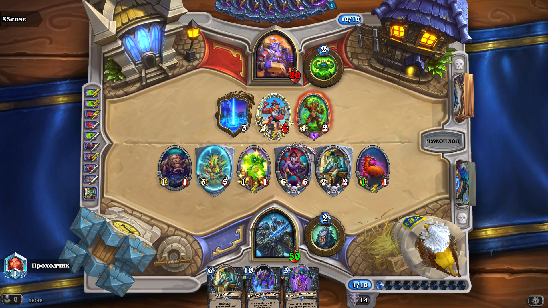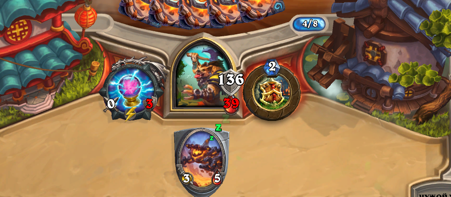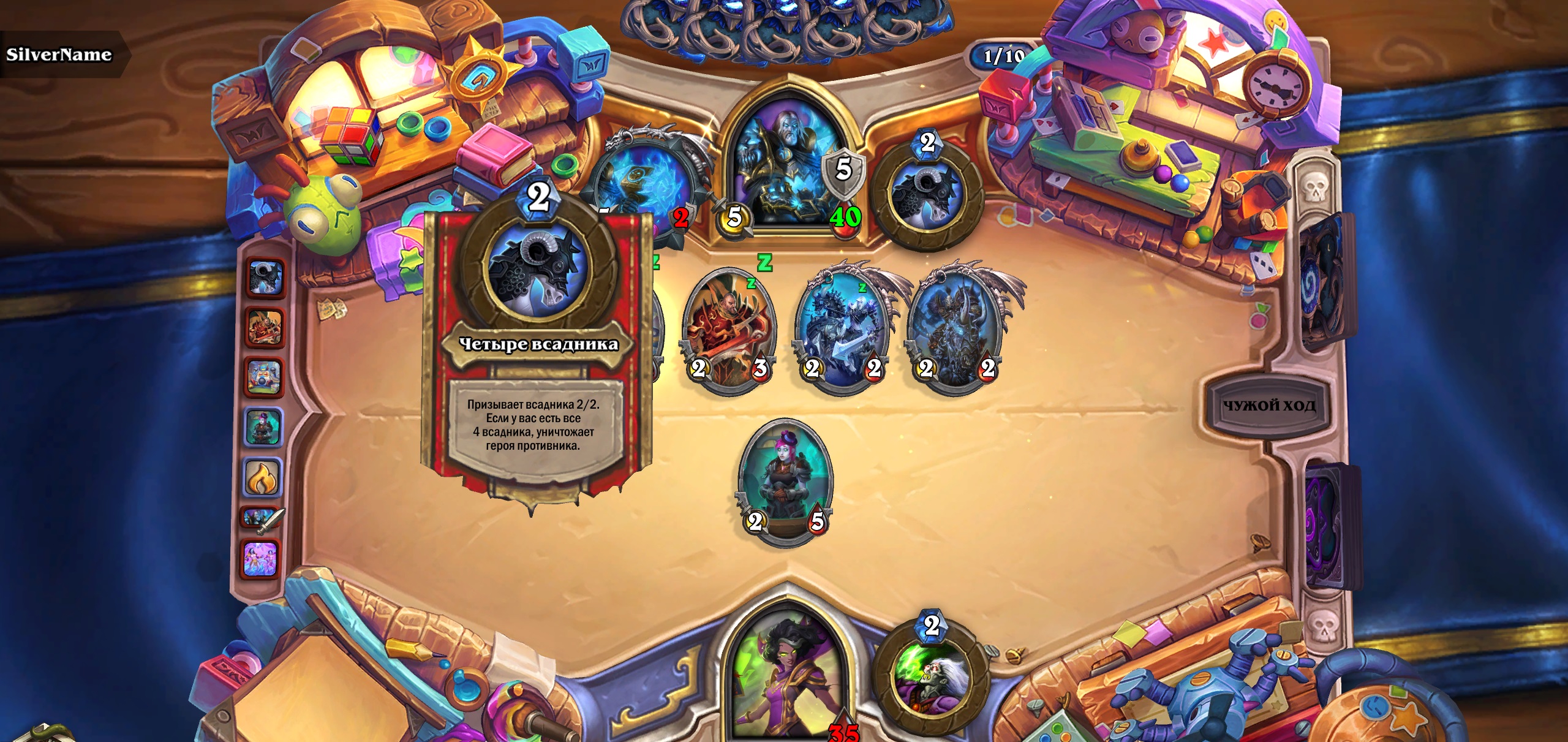 Всегда есть баф абилки, постоянно по 5-6-7 урона с абилки и засёр стола единичками, лёгкая возможность зачистить весь твой стол, бессмертие, чтоб получить себе лишний ход. Ну и вишенка на торте - комба, где в тебя может влететь до 100 урона. Так как бафанная абилка, карта на срабатывание силы героя дважды и применение силы героя ко всем противникам. Даже если у тебя 2 существа стоят, плюс ты третий - 3 противника, абилка на 8, 48 урона лови родной.