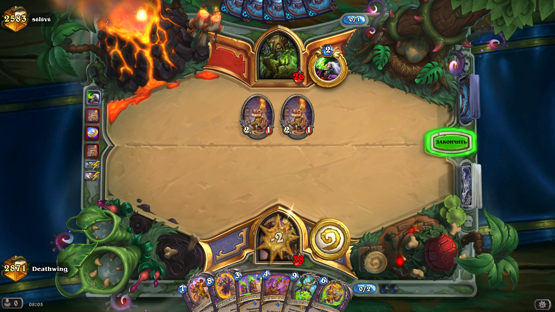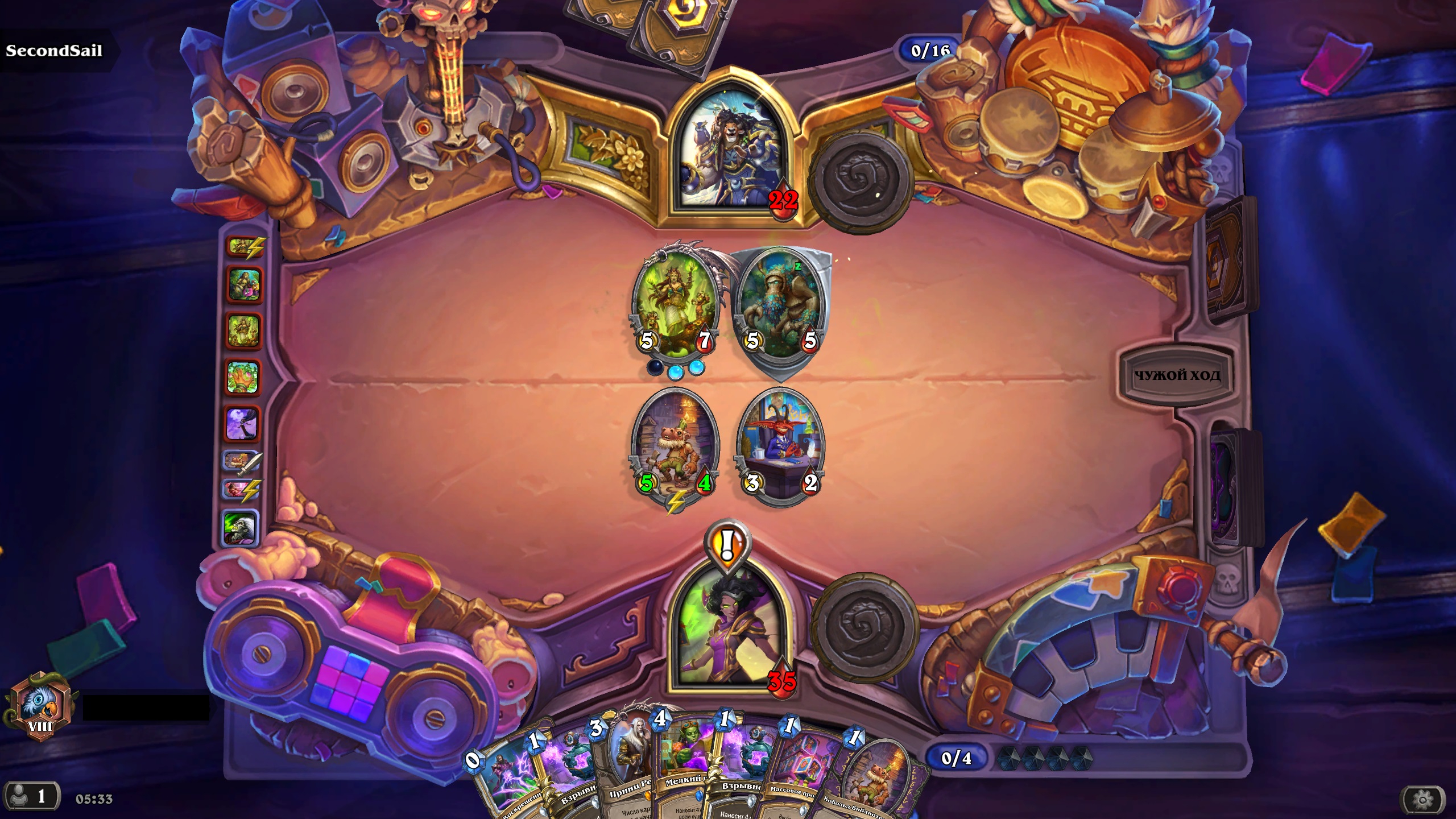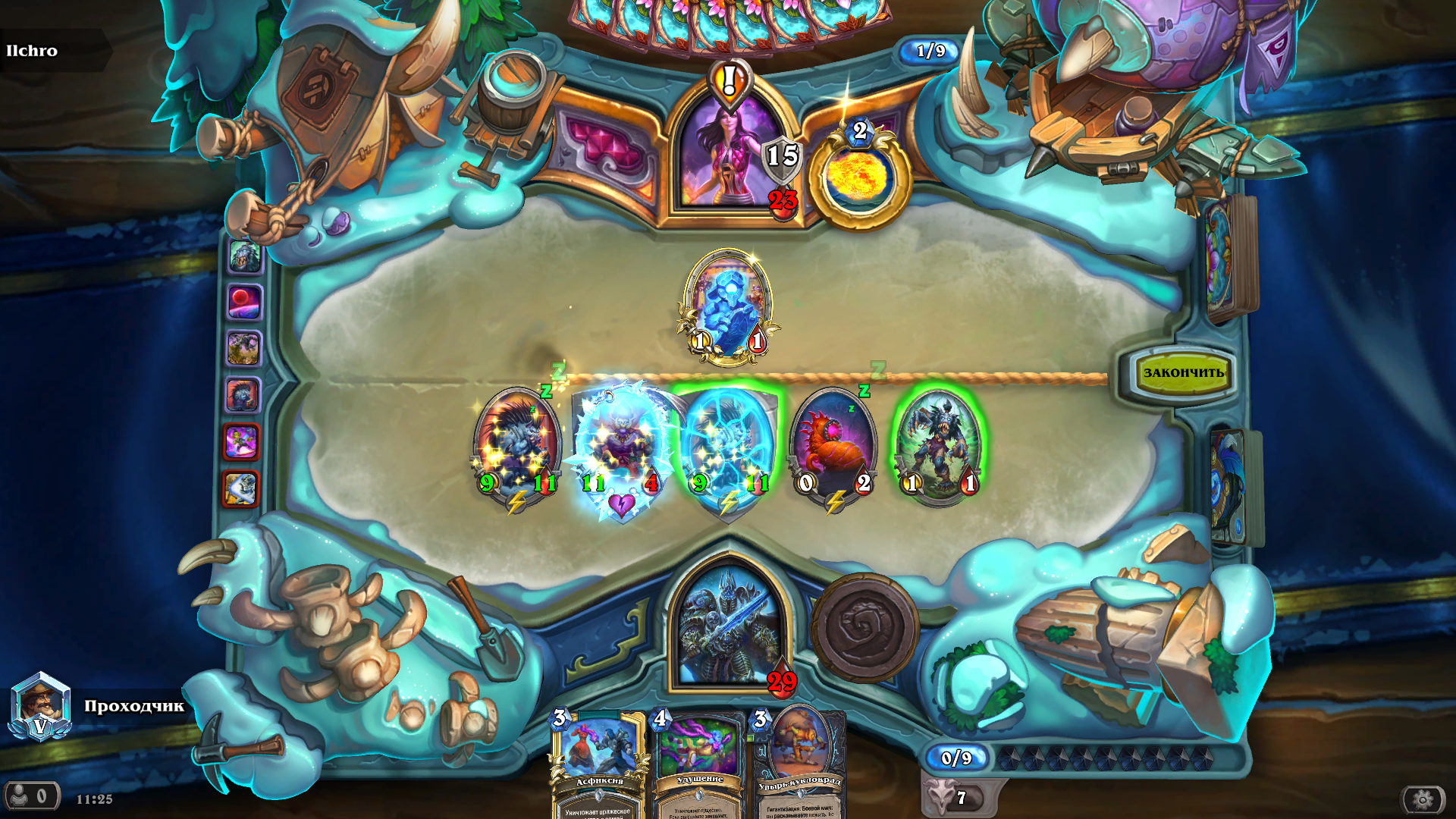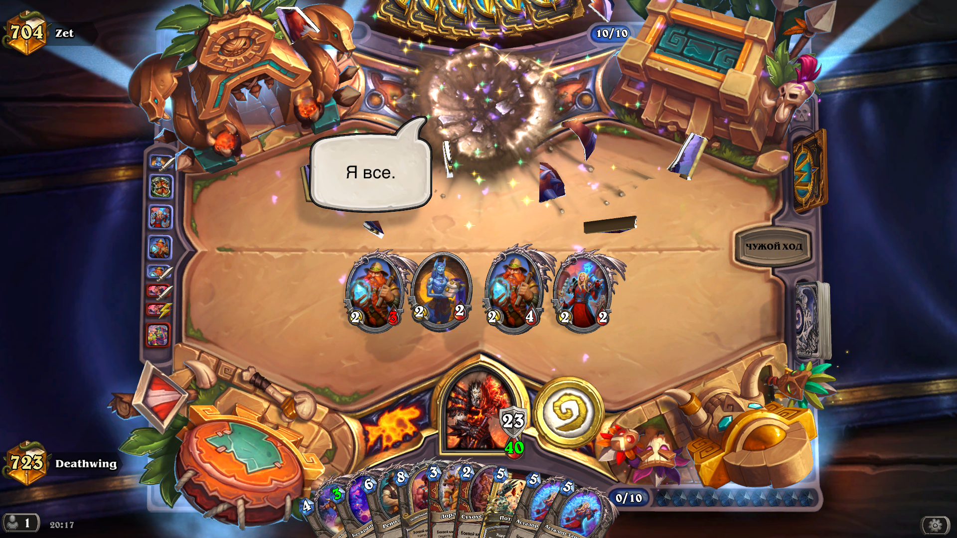 сегодня день благословленный подкруткой в мою пользу, тупо не проигрываю, даже когда играю на несуществующей колоде элементаль-шамана собственной сборки, все равно как-то вовремя приходят нужные карты для летала, оппоненту не хватает ответов, чтоб отбиться и отхилиться, просто чудеса