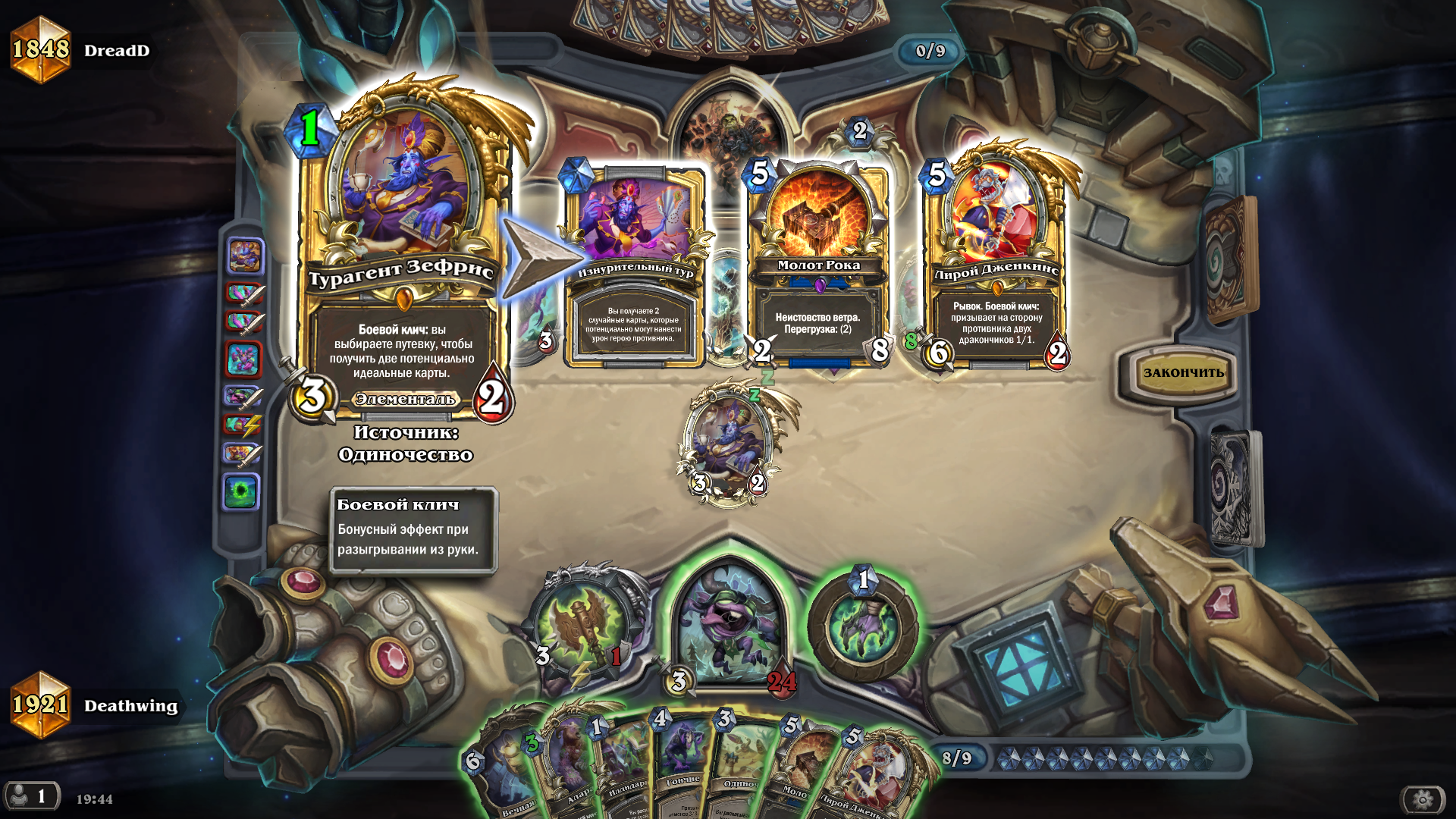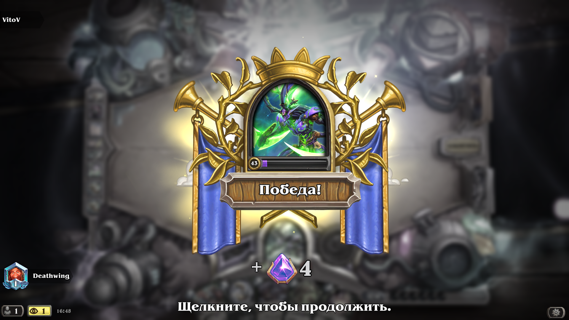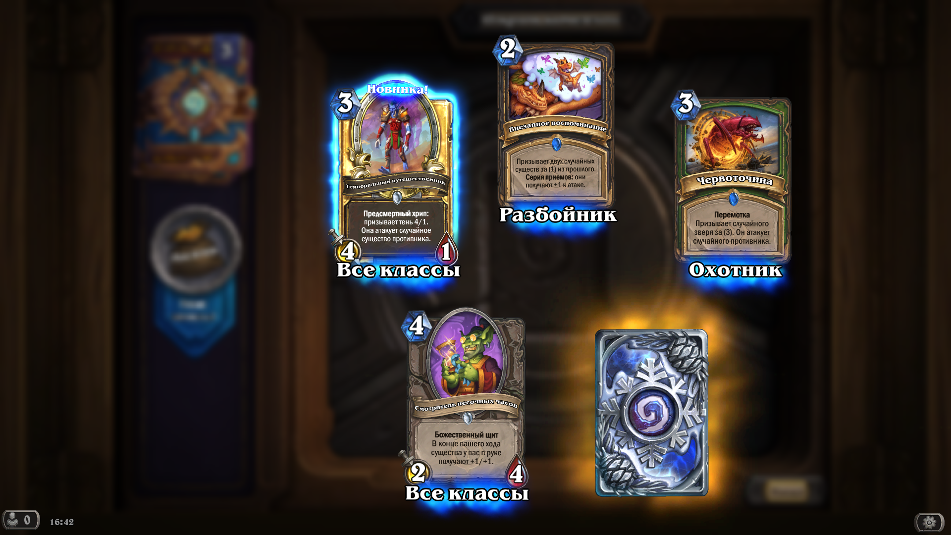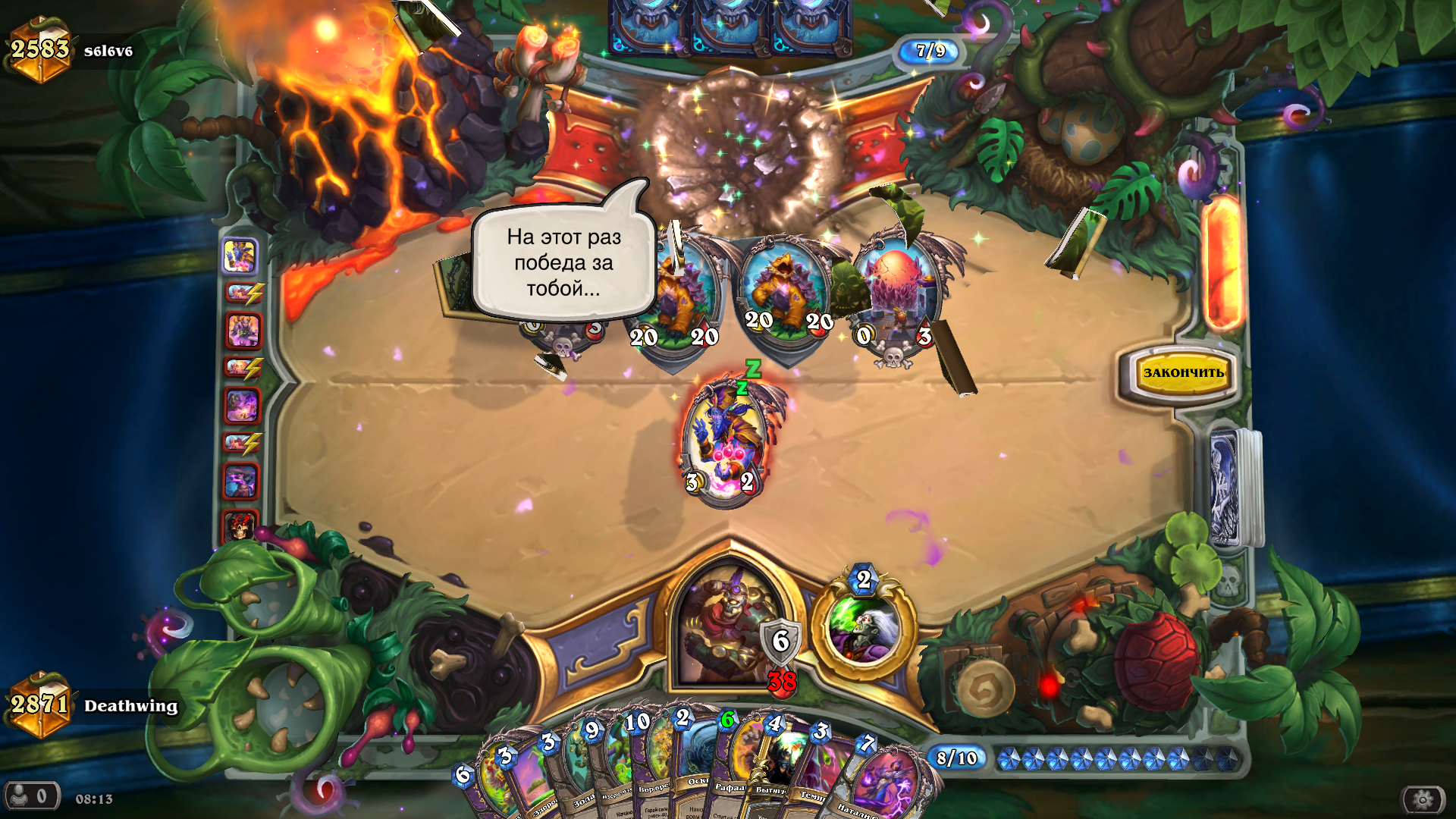 сегодня день благословленный подкруткой в мою пользу, тупо не проигрываю, даже когда играю на несуществующей колоде элементаль-шамана собственной сборки, все равно как-то вовремя приходят нужные карты для летала, оппоненту не хватает ответов, чтоб отбиться и отхилиться, просто чудеса