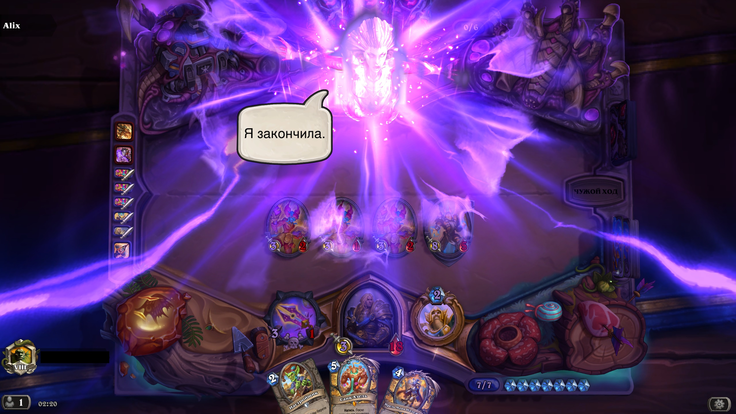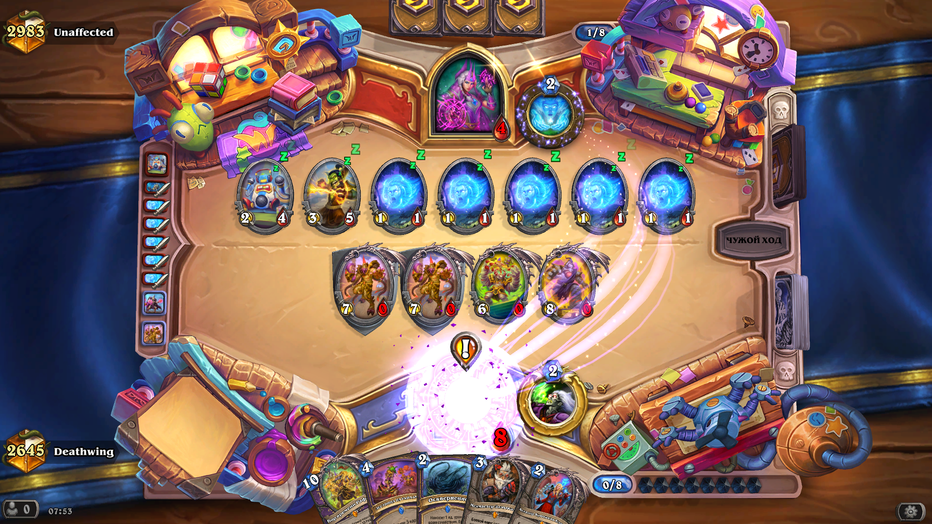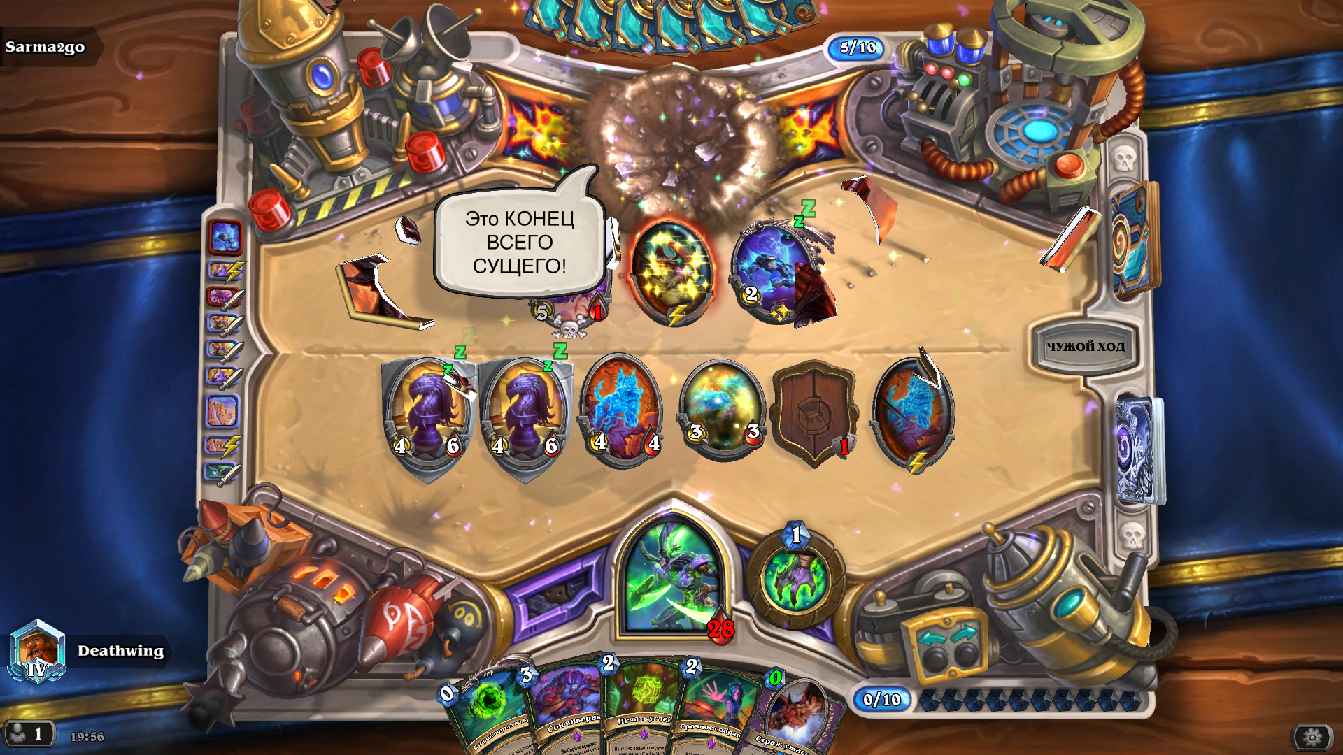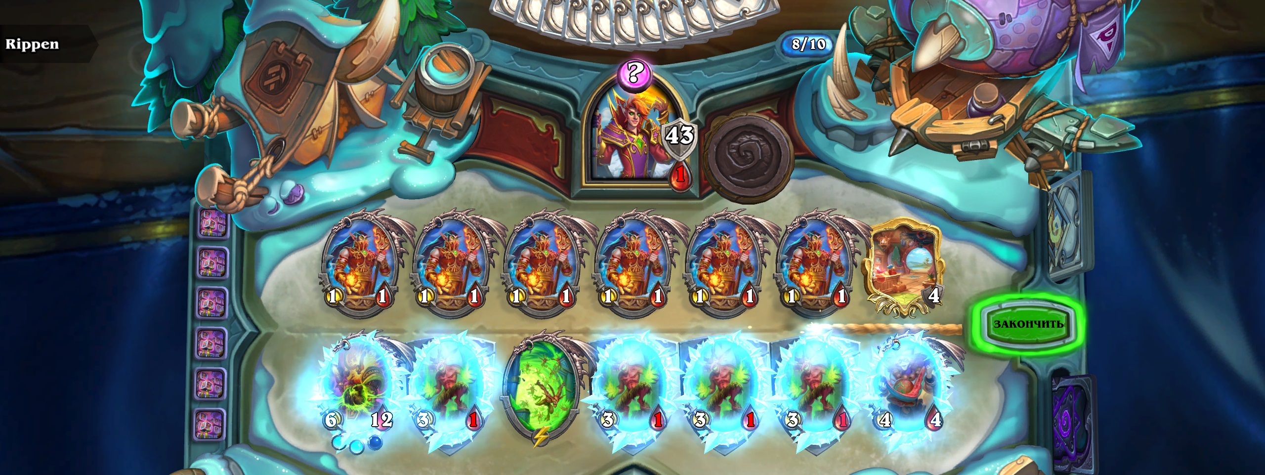 кое-как впервые собрал этого калича с 15 хп для ачивки, был в полной уверенности, что сейчас меня как раз и залеталят за один ход до выполнения, чел уже насрал на стол, превратит всех в рагнаросов или 8\8 демонов и пизда но пронесло, нихуя он не сделал, ачивку я выполнил, и что ещё смешнее, потом даже победил