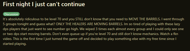 >>50590481 Ну вот токо новый босс рейдовый вышел дракон йобанный, как его проходить надо сначала механики выучить и умирать много. А бабка с бочками там все взрывается, хуйпойми ниче не понятно и больше 3 бочек вайп всего рейда, вполне нормально что пару раз ты умрешь когда боссы только вышли и гир не нафармлен. Омежки ток рвутся, что каждый микропатерн босса и тысячу гайдов никто не посмотрел. Я топ дпс кста всегда, как старшой ваш говорю вам
