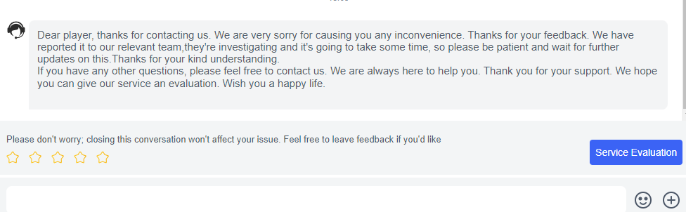 >Уважаемый игрок, спасибо за обращение. Приносим свои извинения за доставленные неудобства. Спасибо за ваш отзыв. Мы передали информацию соответствующей команде, они проводят расследование, и это займет некоторое время, поэтому, пожалуйста, наберитесь терпения и дождитесь дальнейших обновлений. Спасибо за ваше понимание. >Если у вас возникнут другие вопросы, пожалуйста, свяжитесь с нами. Мы всегда готовы вам помочь. Спасибо за вашу поддержку. Надеемся, вы оцените наш сервис. Желаем вам счастливой жизни.