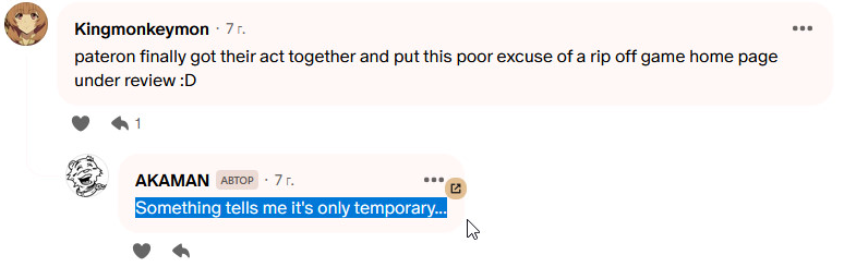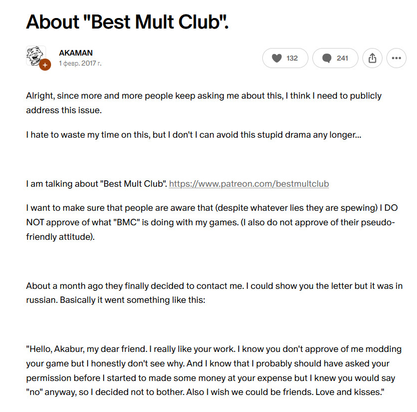 >>50615342 >>50614929 На эфке разраб писал, что его родные узнали о его деятельности и поскольку это большой позор, то дальше он разрабатывать игру не будет.