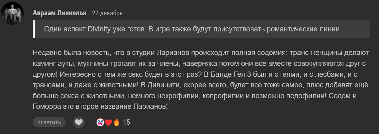 Ни хуя тут чела разваливают. Факты предоставляет в стиле скринов с модами. Пытается доказать что в игре хорошая анимация. Говорит про какой то прорыв в индустрии. Я не могу понять, этот человек или их несколько он тролль или реально психически нездоровый? Если психически не здоровый, почему он имеет доступ в интернет ? Почему его еще не изолировали от окружающих. ПыСы считаю что игра своеобразная. Но ни хуя не прорывная и прям не 10 из 10.