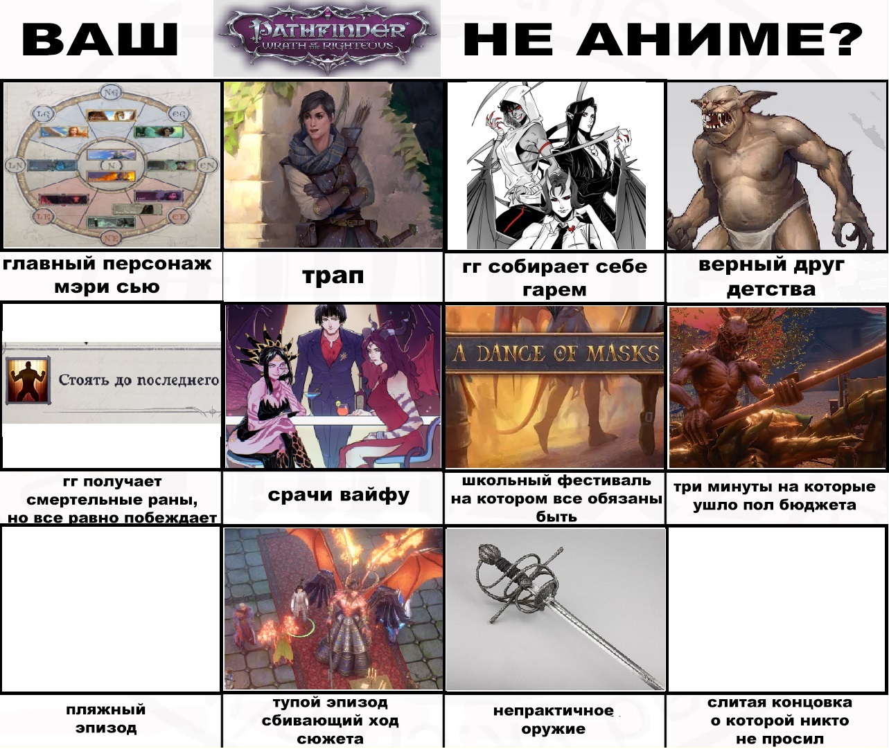 Pathfinder: Wrath of the Righteous В основном тот же Kingmaker по механу, но используемый набор модулей Wrath of the Righteous. Деус Вульт! Возьмите под контроль армию крестоносцев и отправьте демонов обратно в Бездну. Одна из основных механик — мифические пути. По одному на каждую ячейку алаймента. Можно стать Ангелом и нести бобро и свет, Демоном-психопатом, космическим судией Эоном, Азатой-хиппи-анархистом, социопатом-Личом, Трикстером-петросяном (шулерить к дайсам и пробивать 4 стену), золотым Драконом, злобным и ехидным законником Дьяволом, суперменом-Легендой или ебануться насовсем и стать абсолютным злом, от которого с визгом убегают даже демоны — Шагающим Роем. Купить: https://hobbygames.ru/key-pathfinder-wotr Скачать: https://rutracker.org/forum/viewtopic.php?t=6104067