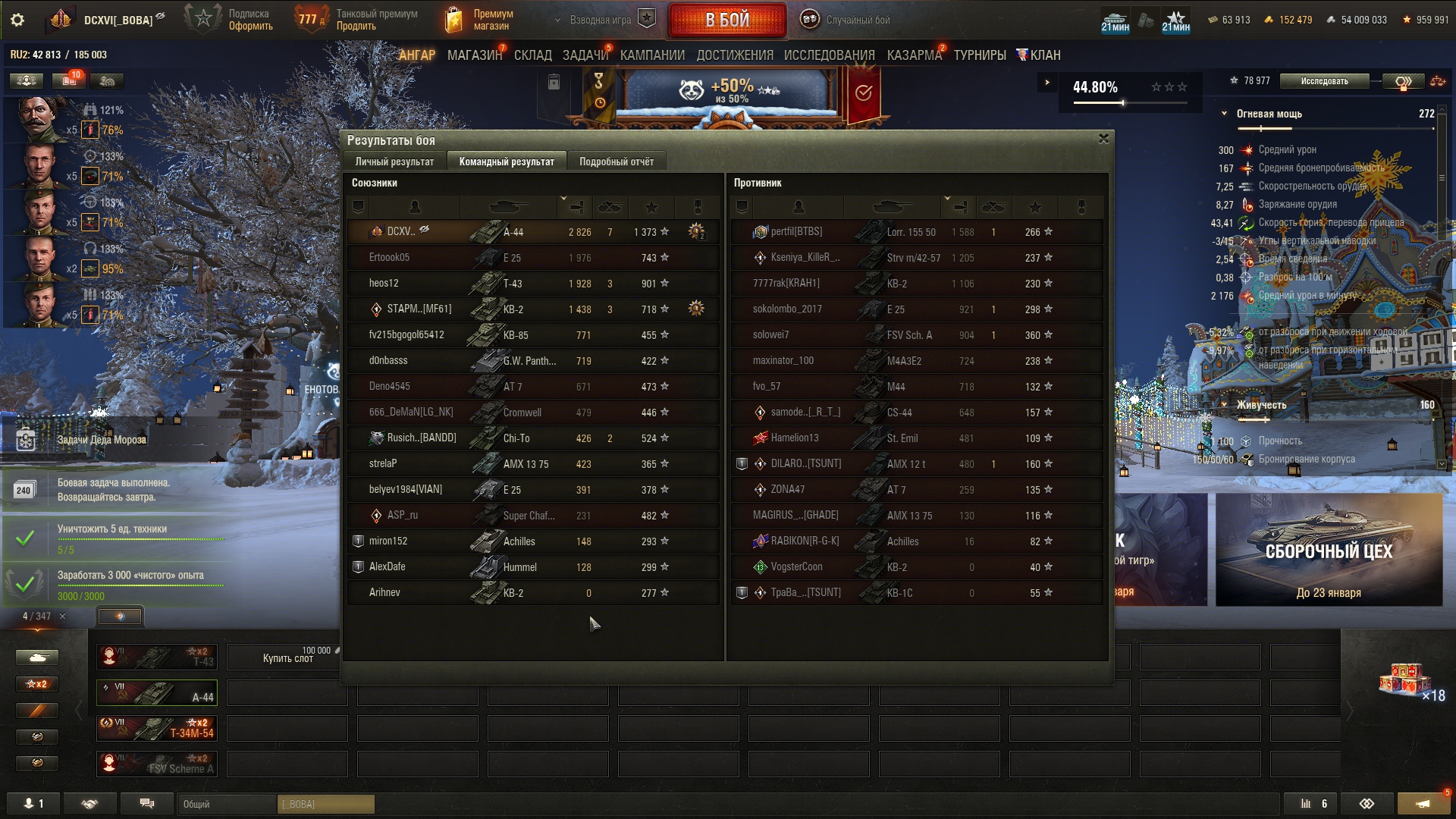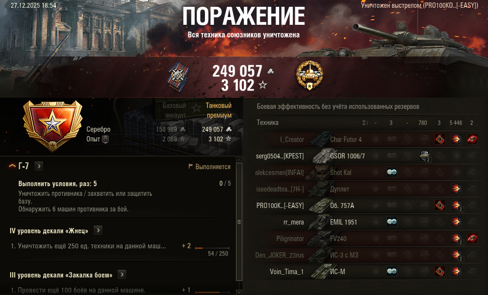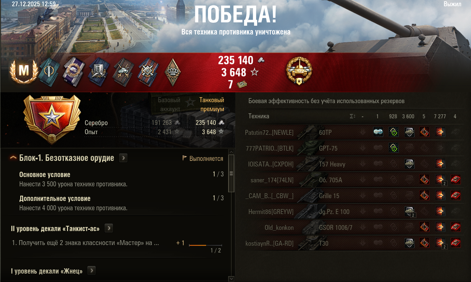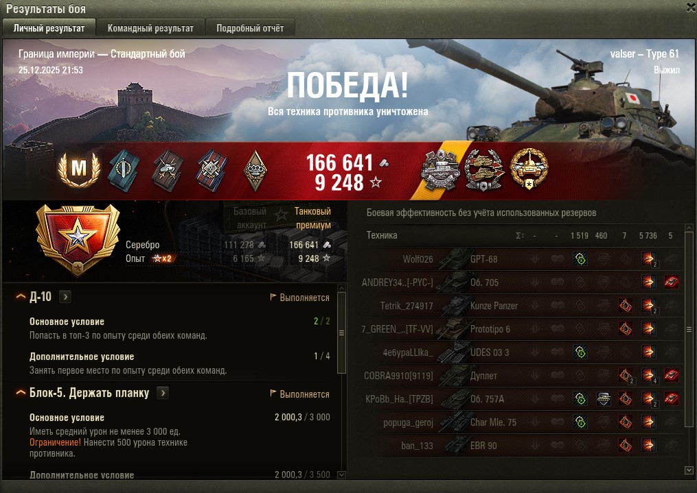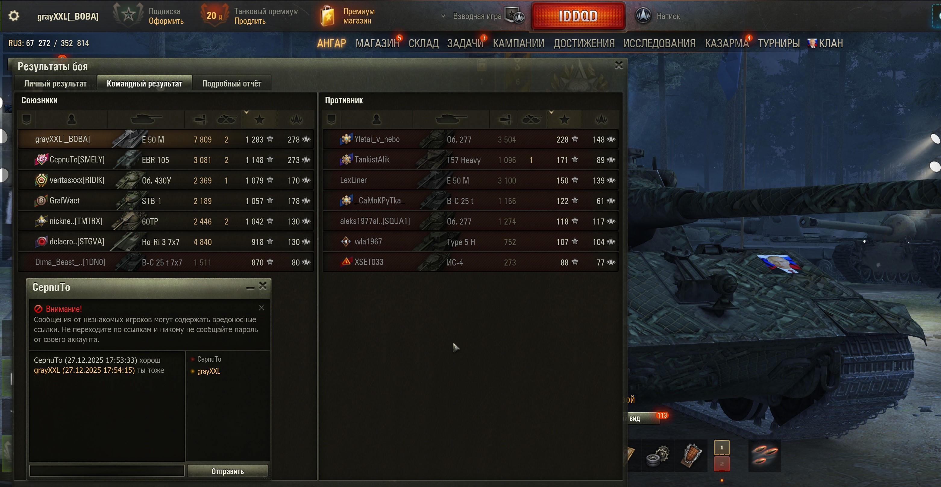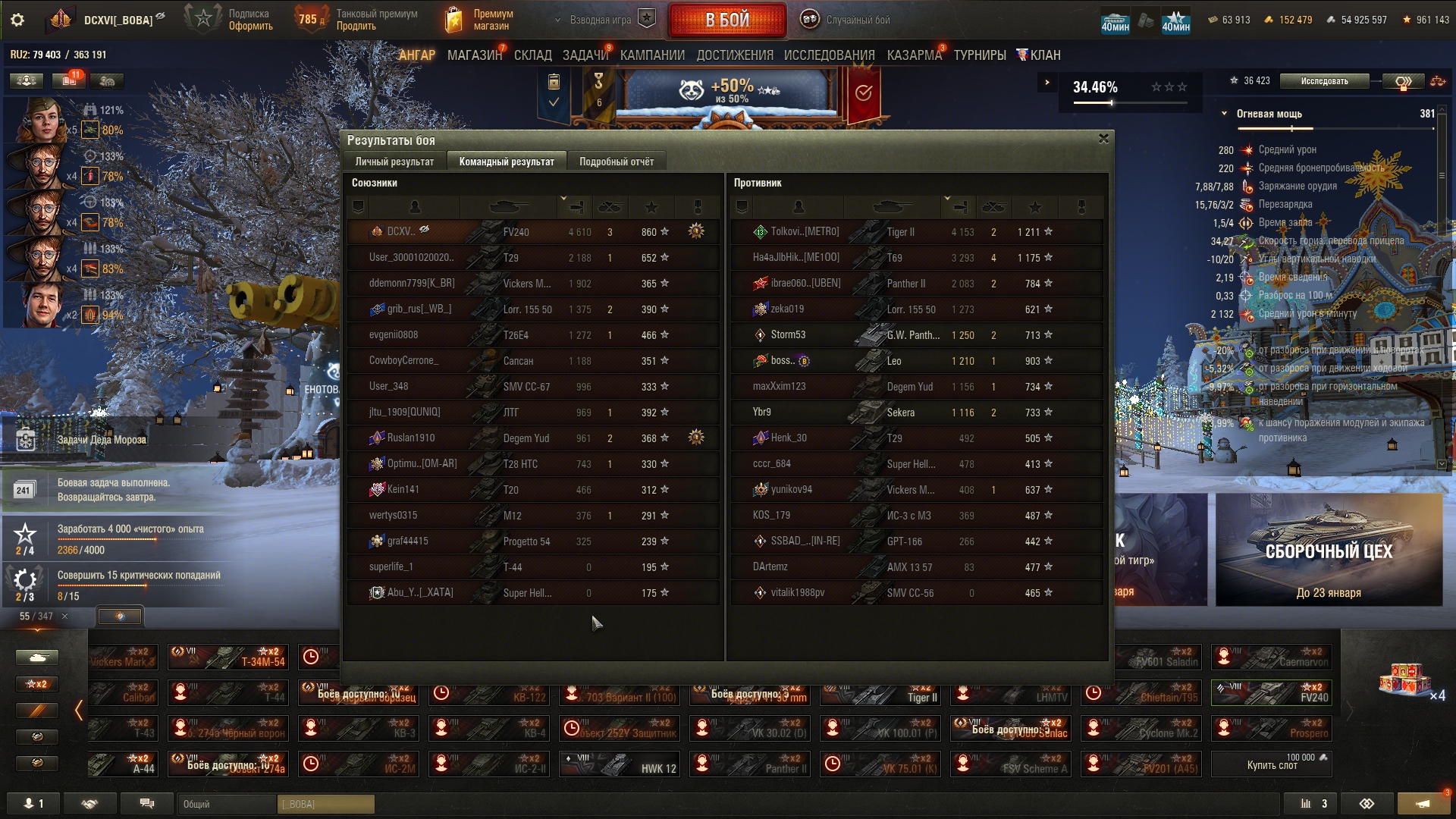 >>50588660 → >>50591102 → >>50591076 → Спасибо анонам за советы в прошлом треде, пердячая тяга не подвела, влетел с трех стами хп в Штюгмауса с 800ми, но видимо кто-то успел вдамажить ему и прокнуло. Осталась задачка на криты, если есть мысли и желание ими делиться, отговаривать не буду. Условие: Основная задача — повредить или вывести из строя суммарно 6 внутренних модулей или членов экипажа, второстепенное задание — уничтожить 5 машин противника. Леха 6к ммр