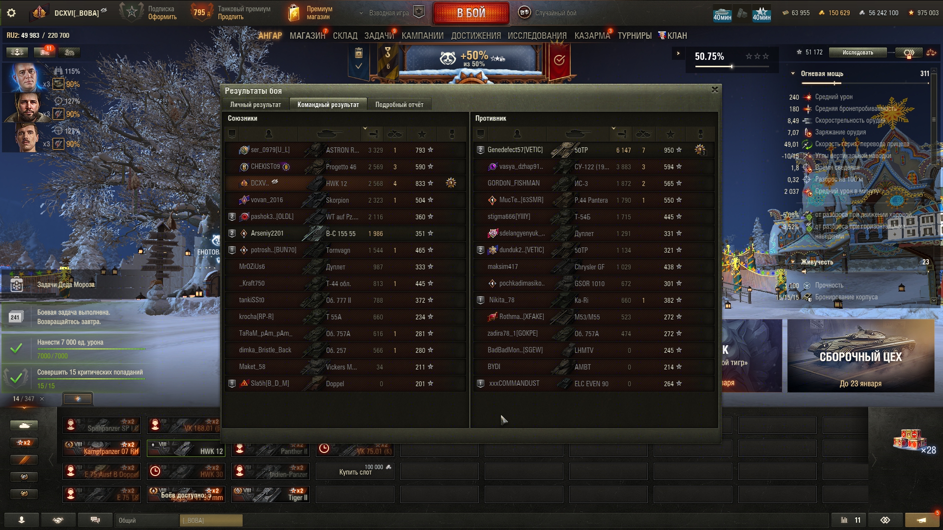 >>50599831 >>50598831 >>50598807 Выполнил таки, кланяемся. Посмотрел, что на акке самое дпмное и выбор пал на деда 6лвла, снарядил на максимальный фарш, и буквально с третьего боя фартануло. Сначала, как леха, перестреливался с т150 целясь в лоб башни, шло ни шатко ни валко, потом дошло, пальнуть в борт ромбующего 150-го, и сразу же подпал, потом еще один. По итогу даже перевыполнил план: 9 критов!