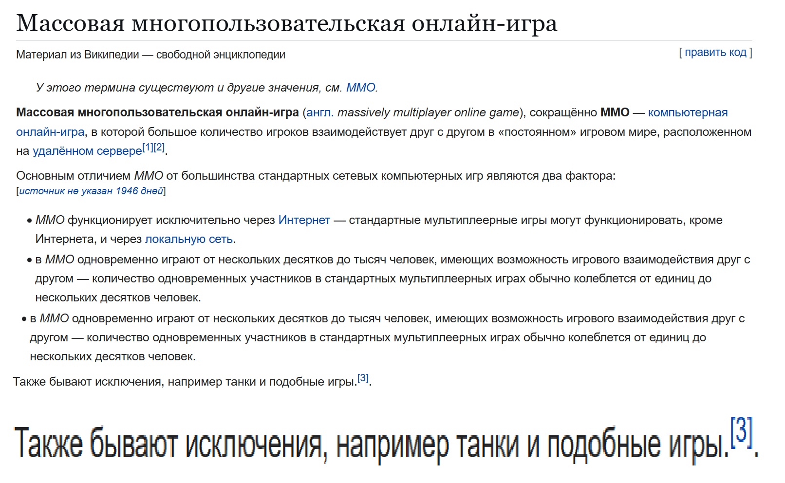 >в педивикии сказали, мол танки не ммо правда непонятно почему танки а не кс например и исключение всмысле это не ммо или наоборот ммо из текста также непонятно >рря танки не ммо Горжусь игроками НАШЕЙ ИСКЛЮЧИТЕЛЬНОЙ тмигры