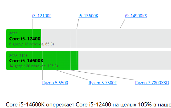 >>50599884 пару вайпов назад 13600kf/14600kf на 6000 и 7200 памяти выдавали как 7800х3д на улицах и развязке например, точно не уровень 12400 должен быть, может троттлит? я бы сравнил еще показатели аиды со скриншотами в днс, обновил бивис, проверил комп на чудо (челик на 14600 ловил майнер с виндоус активатора и в играх энергоэффективные ядра начинали долбиться в 100%). может настройки игры перекручены или упор в видюху