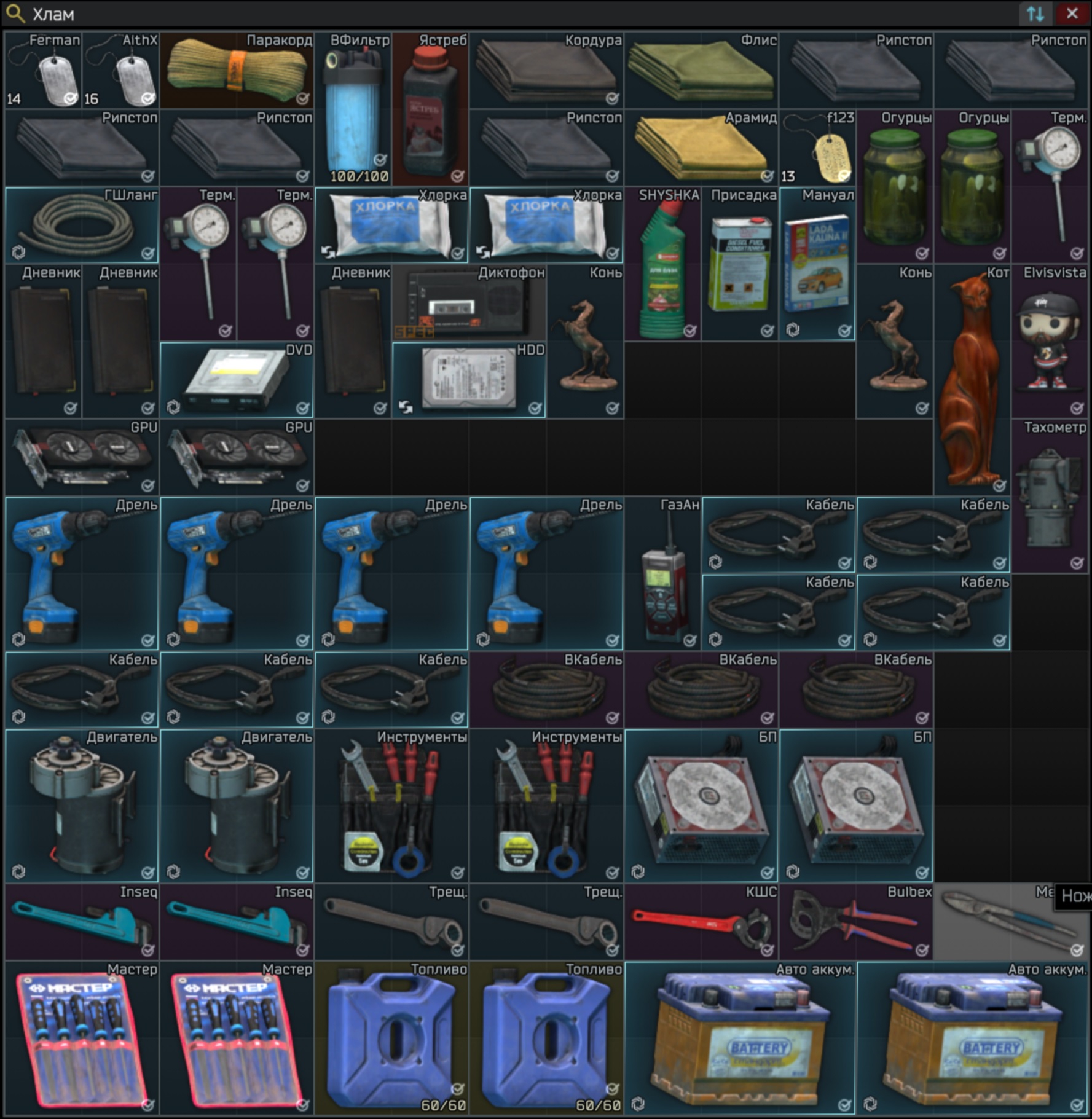 Хлам броники пушки, из "ценного" типо что трудно получить это маски эти ебаные тень смерти и ныне занерфленная cqcb, рюкзаки и еще какаянибудь поебень всякая. Наверное гдето можн нагуглить чо там.