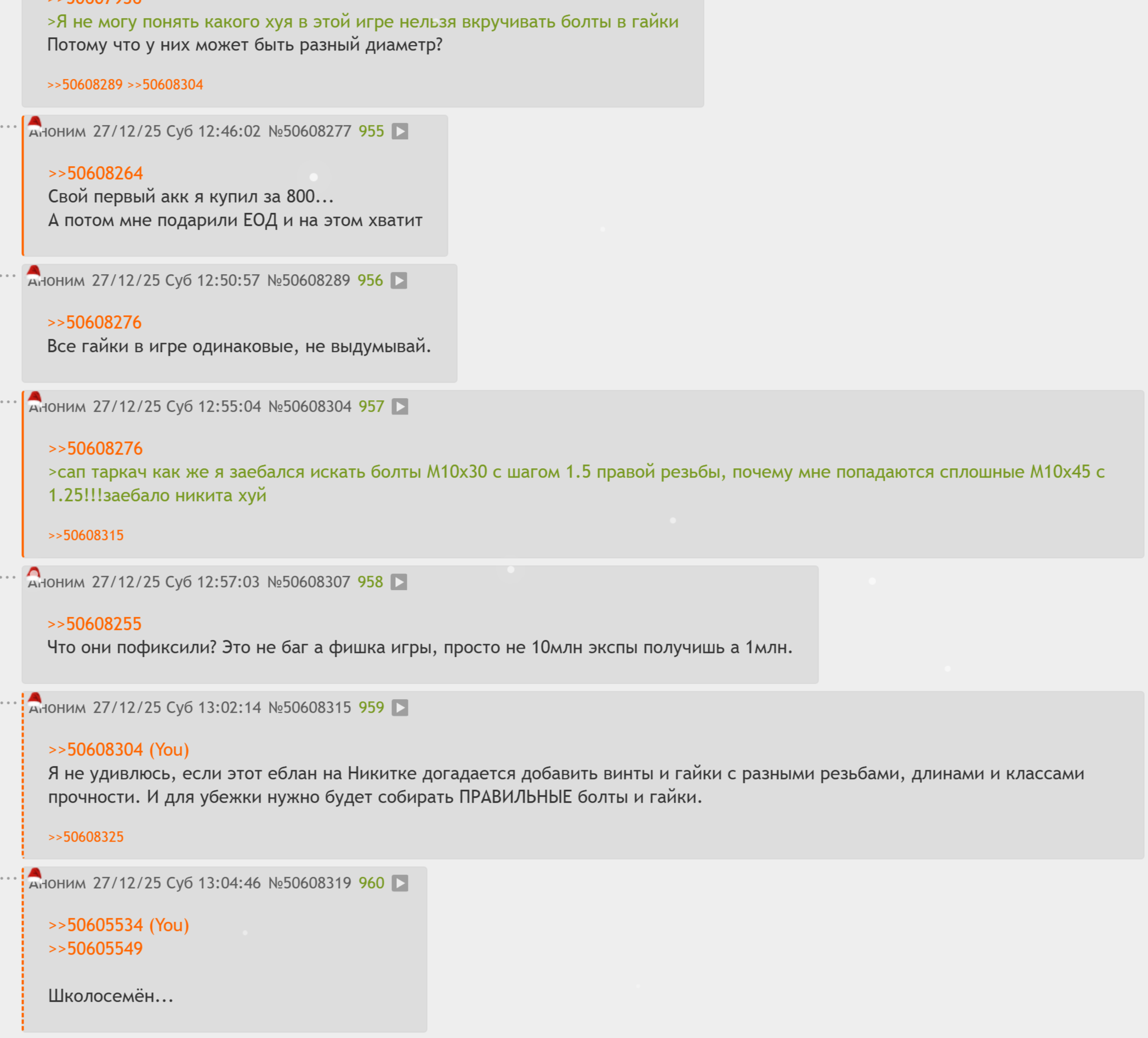 >>50608304 Я не удивлюсь, если этот еблан на Никитке догадается добавить винты и гайки с разными резьбами, длинами и классами прочности. И для убежки нужно будет собирать ПРАВИЛЬНЫЕ болты и гайки.
