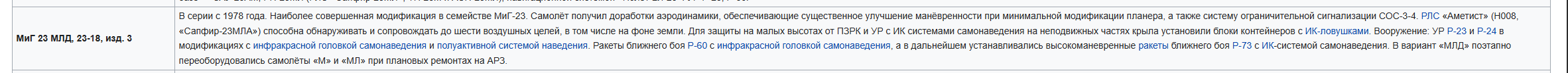 >>50598591 >МЛД не производился по причине перспективного МиГ-29, были только модернизации. Производился, но не только лишь да. >В 1984-85 гг. ММЗ "Знамя труда" построил лишь 66 МиГ-23МЛД, однако большое число истребителей более ранних модификаций переоборудовалось в МиГ-23МЛД на военных ремзаводах. До появления на вооружении советских ВВС и ПВО самолетов четвертого поколения МиГ-23МЛД являлся практически единственным отечественным фронтовым истребителем, способным на равных вести воздушный бой с американскими "звездами" F-15, F-16 и F/A-18. Впрочем, самолет имел и ряд недостатков: на больших углах атаки (правда, в довольно узком диапазоне) возникали колебания по крену. Имелись сбои и в работе комплекса вооружения, которые объяснялись тем, что доработки проводились, в основном, на АРЗ ВВС, а не на заводах МАП.