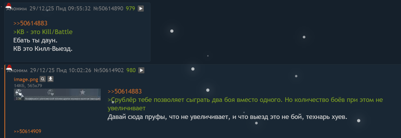 >>50614936 >Перечитай что я писал Ну, читаю. >С учётом срублёров мазутодауны должны делить своё кв пополам Ты написал что дублеры увеличивают показатель "кв". Далее тебя обоссало два человека, указав что под кв всеми включая игру подразумевается "килл - выезд", и показателя "килл - баттл" не существует, с чем ты сам и согласился: >Килл-Бой это КБ блять и на КБ в среднем всем похуй С чем в свою очередь я тоже согласился: >Ну да, всем действительно похуй. Ведь нет такого показателя, который ты сам выдумал. Ведь кв это килл - выезд, который и считает игра. Который руинится дублером точно также как вторым респом другого танка. С чем ты все еще здесь не согласен, или что тебе не понятно? Что ты хочешь доказать? То что ты считаешь себя очень умным но таковым не являешься ты мне уже доказал. А по теме спора осталось что-то?