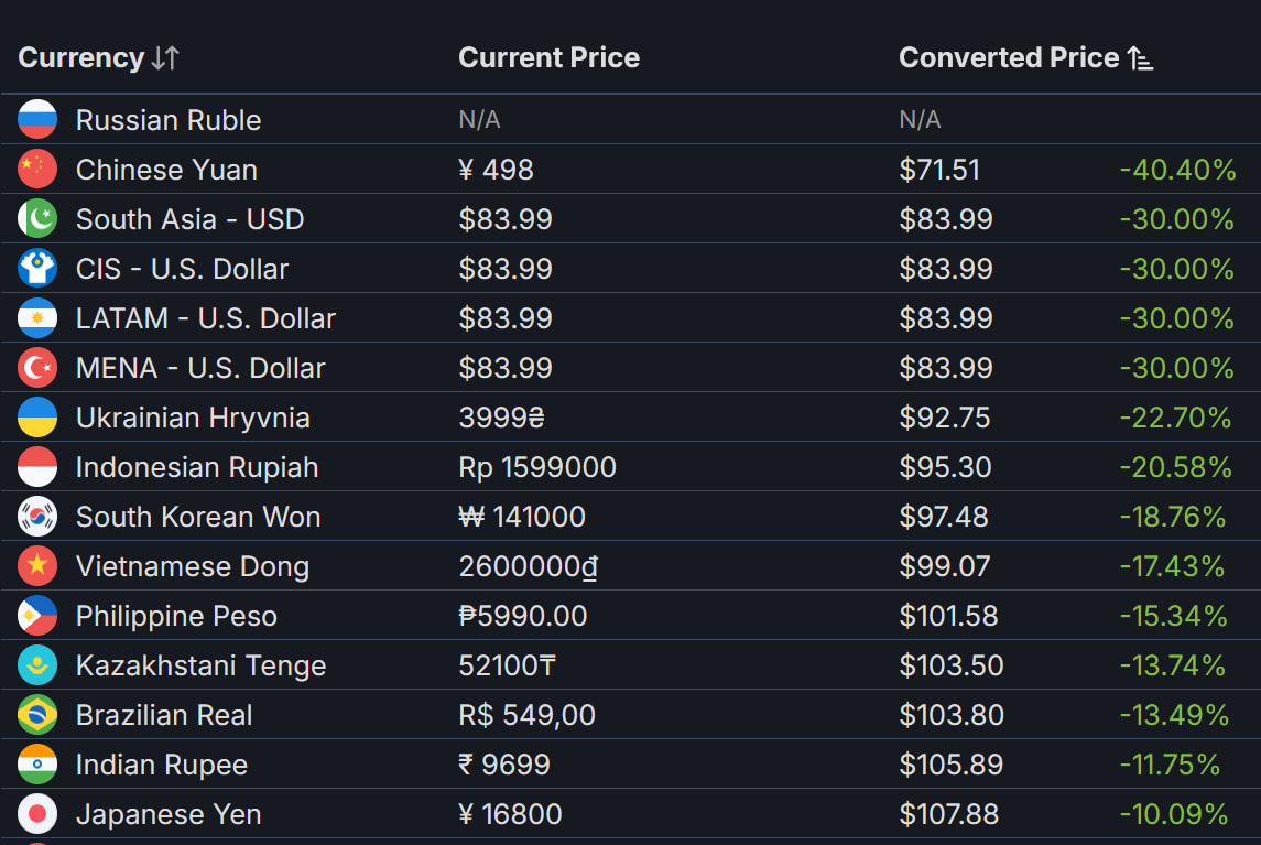 >>50695084 В том что в остальном СНГ где цены в $ она стоит 30$ за обычную, и 50$ за премиум, а в КЗ нет региональной цены и в тенге она стоит 70$ и 120$ как в США