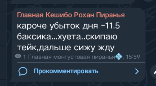нее ты не понял сначала он потерял > в маменте было -45 потом отбил до > 2 бакса отбить до бу дня и уже под конец > убыток дня -11.5 баксика...хуета..скипаю тейк