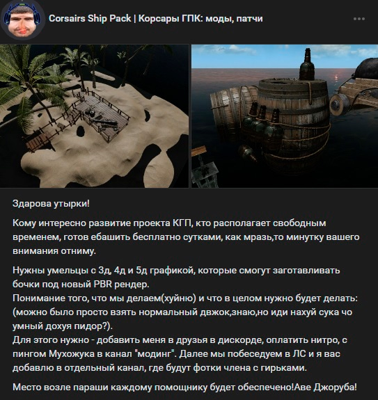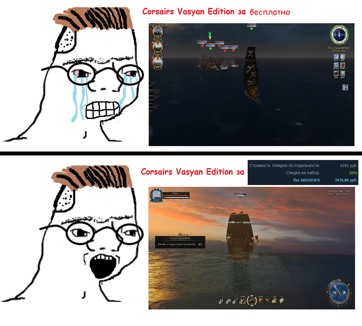 Вообще, ситуация с калом и шипкалом выглядит так: стоит леопольд на новеньком корвете (шипкале) и говорит команде "донатьте на бусти, и я нам сделаю фрегат!". Ему надонатили, тут подплывает гнилая тартана с обосратой чайками палубой (кал на релизе), с него приплывает лодка с жирубой, он подходит к леопольду, протягивает ему 5к и говорит "слушай, я щас из своей тартаны буду делать мановар, давай твой фрегат в мой флот". Леопольд вместо того чтобы посмеяться и продолжить выполнять голы с бусти и впиливать новый контент (банально куча кораблей, квестов и моделек оружия из других корсаров до сих пор не в шипкале) во всеуслышанье сказал "ах так!? да я щас сам мановар сделаю!". Жоруба пожал плечами, уплыл на свою тартану и открыл огонь по корвету. Леопольд, корвет которого на тот момент даже не чувствовал мелкий калибр конкурента, вместо спокойной переделки во фрегат, начал полировать кулеврины со словами "щас отполируем и дадим ответный залп". В итоге уже второй год полирует. Вместо тартаны против него уже бриг (обновленный кал) с баркасом (реконом) на подсосе, а кулеврины до сих пор не отполированы для первого ответного залпа. Переделкой в мановар даже не пахнет.