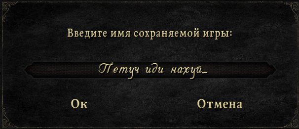 >>50630055 ```c object save, load; save.text = "Хуй Жопа"; SendMessage(&GameInterface, "lsa", MSG_INTERFACE_SAVEOPTIONS, "dialog", &save); // Создать в корне игры файл dialog со строчкой "text=Хуй Жопа" SendMessage(&GameInterface, "lsa", MSG_INTERFACE_LOADOPTIONS, "dialog", &load); // Запихать её на объект load в виде атрибута Log_Info(load.text); ```