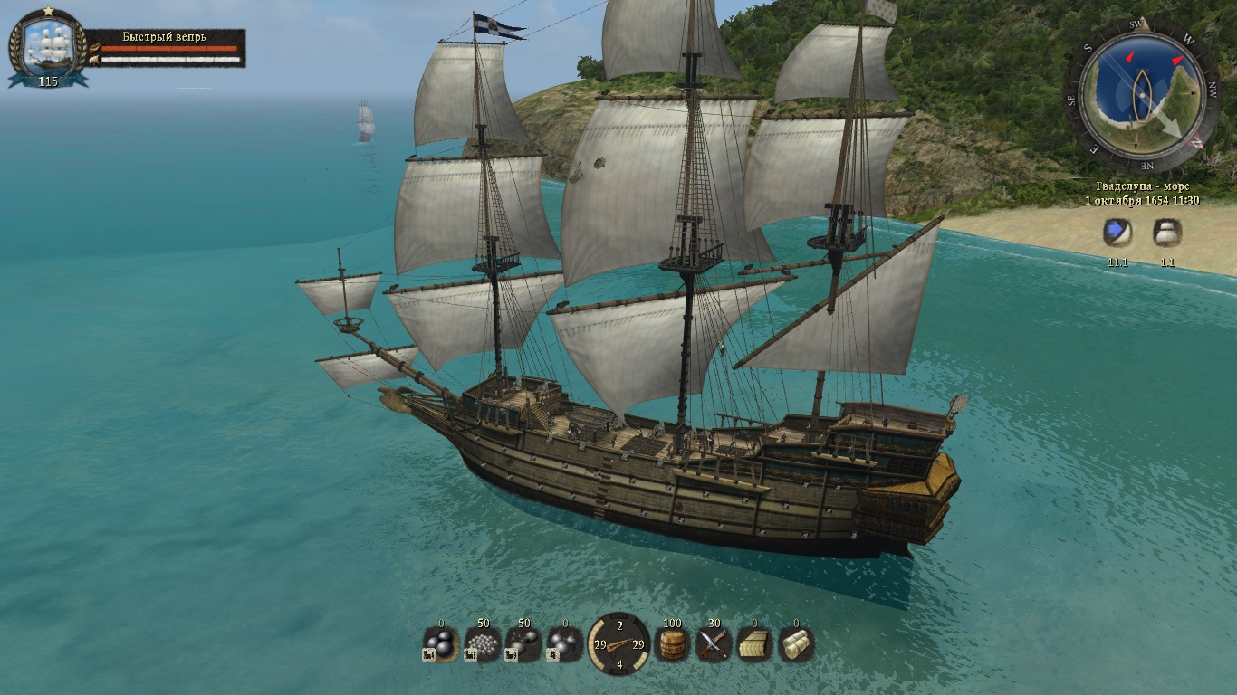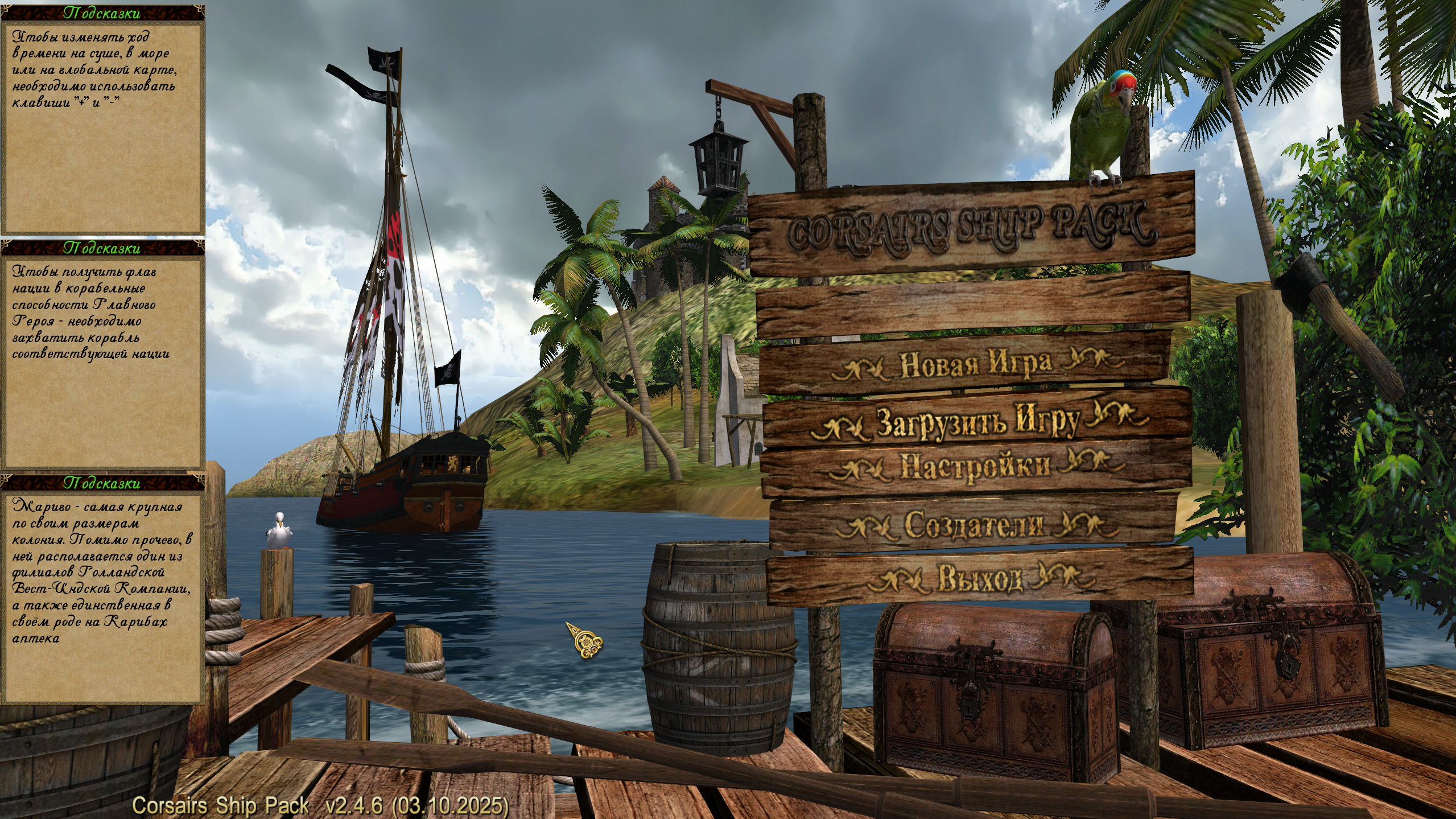 Главное меню сразу настраивает на нужный лад и готовит к калтенту: 1 Суперразмытые текстуры земли 2 Спрайтовый куст справа 3. Огромные окошки "Подсказки" с выходящим за рамки шрифтом 4. Корабль с порванными ХхХ_МоДнЮчИмИ_ПаРуСаМи_хХх 6. Бочка (пока бесплатная)