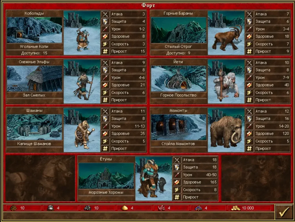 Кронверк имеет пиздатых йотунов, снежных эльфов и йети; интересных мамонтов и шаманов. Но вот кобольды (какие-то невнятные хомяки), апгрейд снежных эльфов (выглядят как застрельщики из Age of Empires 2, и при этом без названия даже нельзя понять что это эльфы, собственно) и особенно бараны расстраивают. Последних я вообще не понимаю - волки и кабаны по крайней мере могут разорвать или вспороть клыками своего противника. Но трудно воспринимать всерьёз барана, который бодается насмерть. Плюс, для такого зарядного животного апгрейд чересчур кучерявый - и иммунитет к холоду, и усиление атакующей магии. Подобного рода абилки должны быть у более фантастического существа. За лайн-ап - 7/10.
