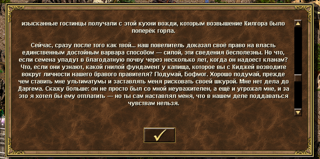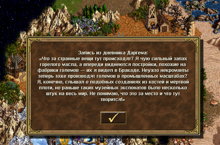 >Думаю новые изменения системы событий и хижин провидцев приведут к появлению совершенно совершенно ебанутых, в хорошем смысле, сценариев. В HoMM4 картоделы мутили кастомные квесты с диалогами, логическими паззлами, разной рпгшной хуйнëй, самодельными механиками и тп. Представь ты хочешь перейти через мост, а там не просто абстрактные цветные ворота не пускают, а полноценный нпс, с которым поговорить можно, у него даже портрет есть. Он просит либо денег заплатить за проход либо принести ему что нибудь. Можно попросить его про лор карты рассказать. Можно охуеть и напасть на него, ограбить его или получить пизды от его ручных виверн. >Подобное давно напрашивалось, прекрасно же работало в Кингс Баунти или четверке, но наверное тяжело было реализовать? Очень жаль что это сразу не было добавлено в ванилле, были же зачатки в виде Пещеры демона из двушки, за столько лет уже были бы сделаны сотни годных приключенческих карт.