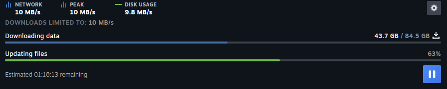 Бля ебаный стим, я забыл что там игра обновляется и закрыл его, теперь открыл и он по-новой 100 гигов качает, ебануться. Это говно даже не спросило хочу ли я его закрыть во время апдейта