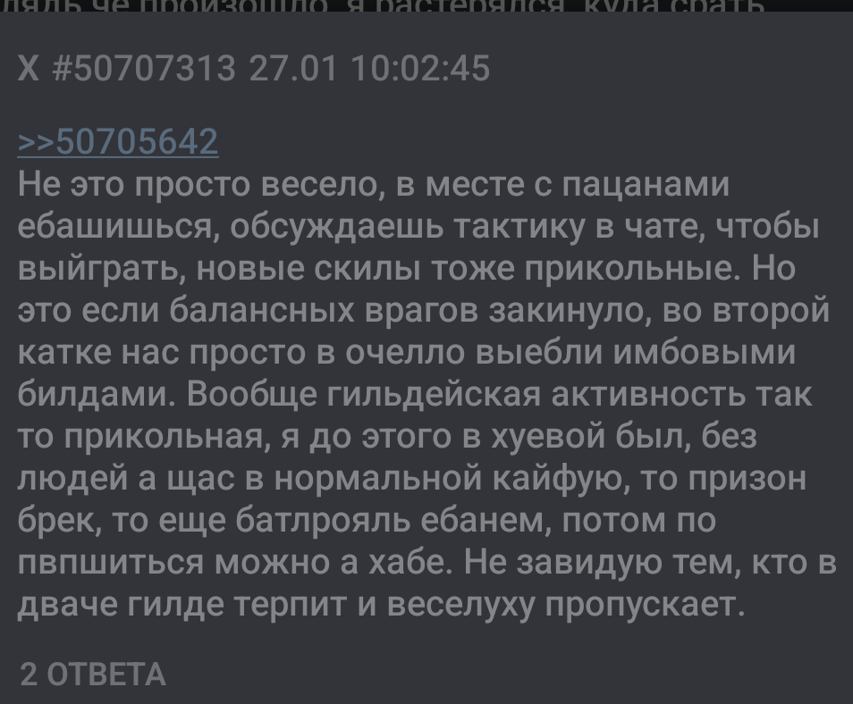 >>50706378 >>50706549 Да, эффекты это наверное лучшее. Они всегда перед глазами в любом бою, а шмотки и не видны в бою, ты привыкаешь к ним >>50706454 Я бы вообще убрал любую награду за квесты и сделал бы их побольше всяких разных на любой пук, от каждого непися, но повысил бы награды за энергию >>50706415 Хз, сейчас просматривал скрины и обратил внимание, что тот же тредовичок. Я так понял мне каждую неделю это генерит, на этой ещё не открывал газету