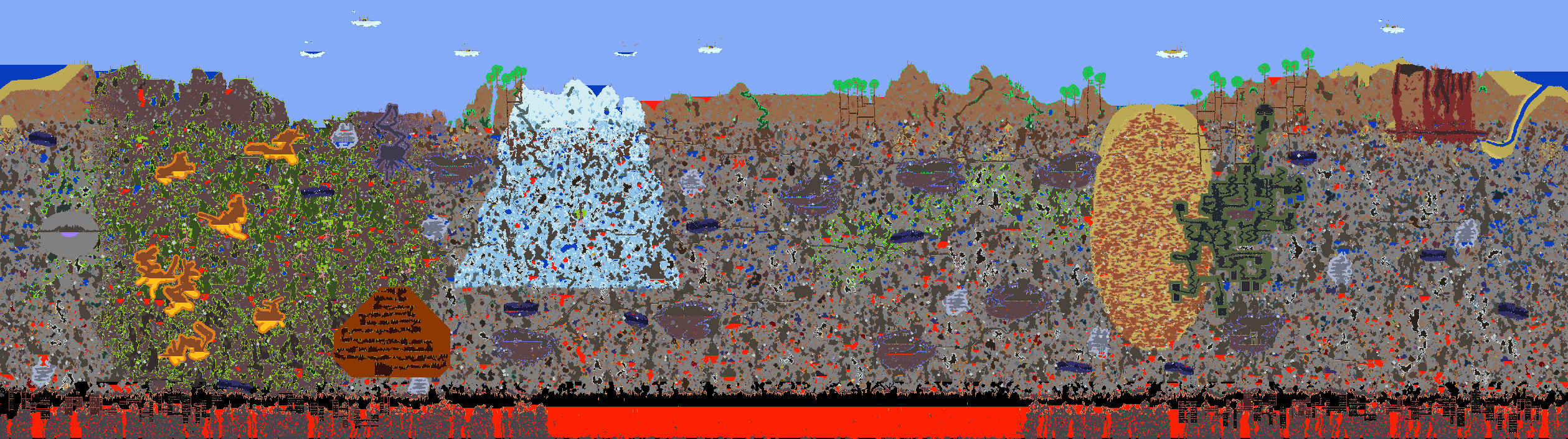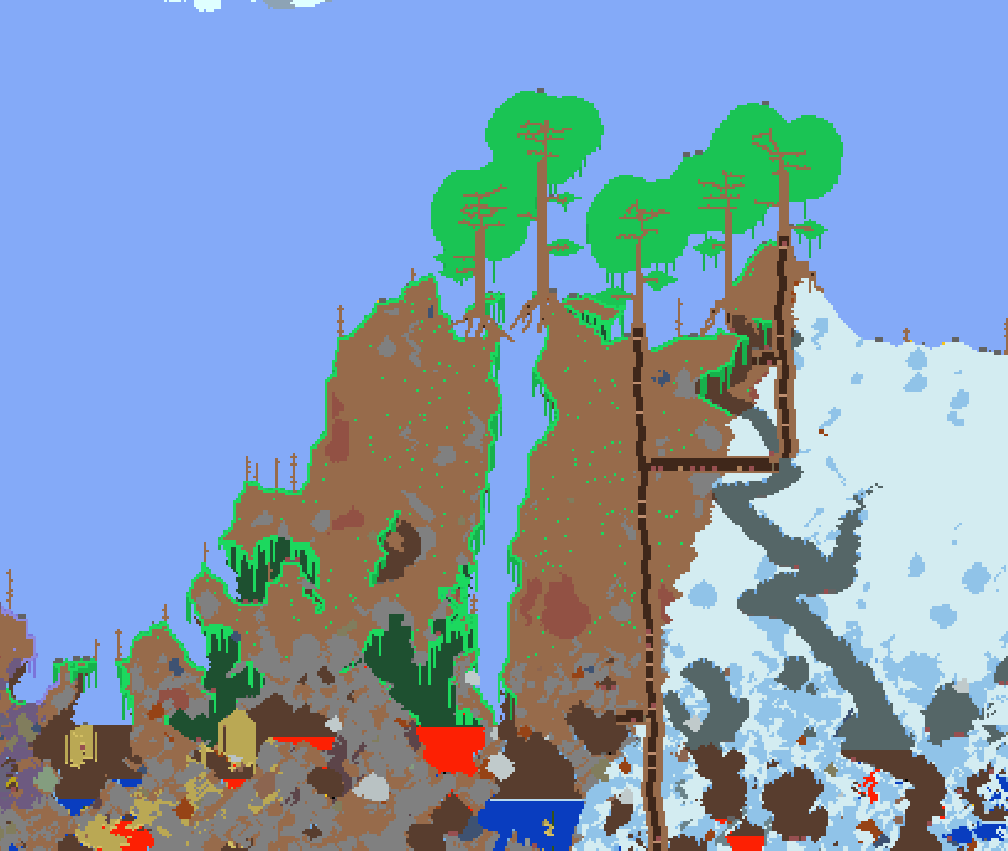 >>50738671 я логинюсь на дейли рогалик и всё пока что, тут недавно вышла террария 1,4,5 и я чето загорелся опять поиграть, хочу скомбинировать сид drunk world + for the worthy, пытаюсь сгенерировать хорошую карту т.к. играть я буду только на этой карте всегда, в прошлый раз на старой версии я наверно неделю карту генерировал, хочу чтобы и пирамида и зачарованная пещера были, и данж в новом дизайне и в целом структура карты была красивая, ну пока что генерация безуспешна, лучшее что смог пикрилейтед, мне в целом всё нравится кроме того что пирамиды нету стартовая зона хорошая с границами, слева спуск в пещеру, справа деревья, биомы друг на друга не накладываются, в хардмоде ущерб будет только снежному биому и то возможно минимальный, данж новый, оазис, на пике 2 такой органичный хаос получился, уже представляю как рою туннель вниз из снежного биома и прокладываю мост через это ущелье, но вот пирамиды нету это прям трясет меня