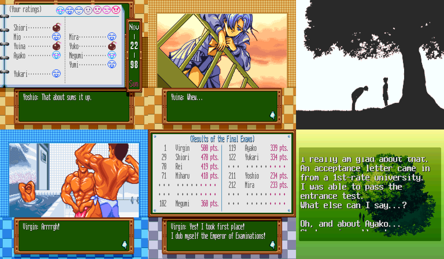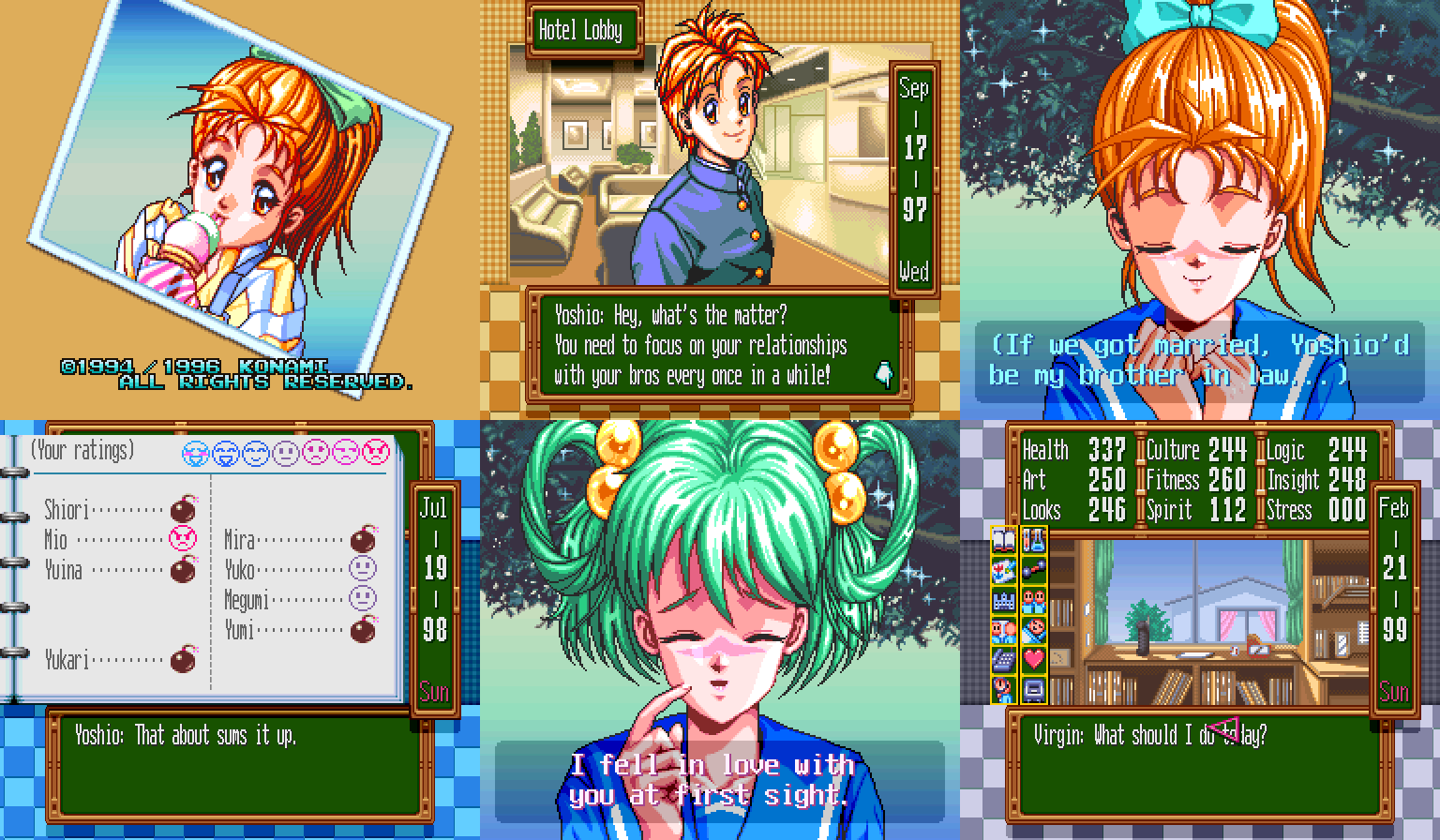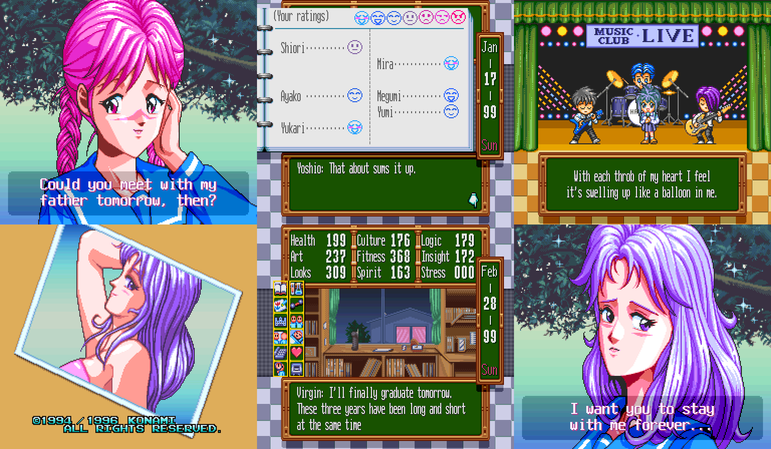 Но вернемся к нашим баранам. Tokimeki, чтоб ее, Memorial тоже имеет свою отличительную черту, и лучше бы она ее не имела. С виду-то все типично, хотя и слегка примитивно (но сделаем скидку на почтенный возраст, чего уж там). Распорядок на каждый день нам не светит, так что выбираем действие, которое наш экранный аватар будет дрочить всю рабочую неделю с понедельника по субботу, не считая праздников. Выбор там небогат: можно подтягивать гуманитарные науки (которые почему-то перевели, как культуру), естественные науки, искусство, физуху, социалку (опять же переведена, как интуиция/проницательность) и внешку. Ну или можно, как истинный двочер, дрыхнуть и ничего не делать, восстанавливая себе здоровье. По воскресеньям и праздникам можно делать все то же самое, причем оно дает гораздо больший выхлоп, а еще можно звонить по телефону (один звонок съедает весь день) или сходить на свиданку, если таковая на это день назначена. Еще можно вступить в один из школьных клубов и качать связанный параметр через него- это и быстрее, и можно там определенную деваху встретить. Только спортивные клубы будут съедать каждое третье воскресенье на обязательную тренировку, за неявку на которую исключат. Короче говоря, эта часть самая простая: все три прохождения я надрочил мозоль на указательном пальце такие статы, что в лучший универ или лучшую компанию брали без вопросов.