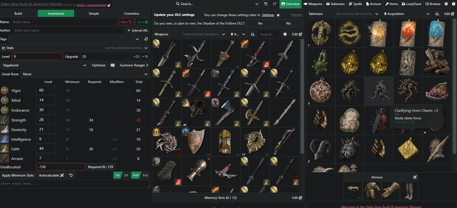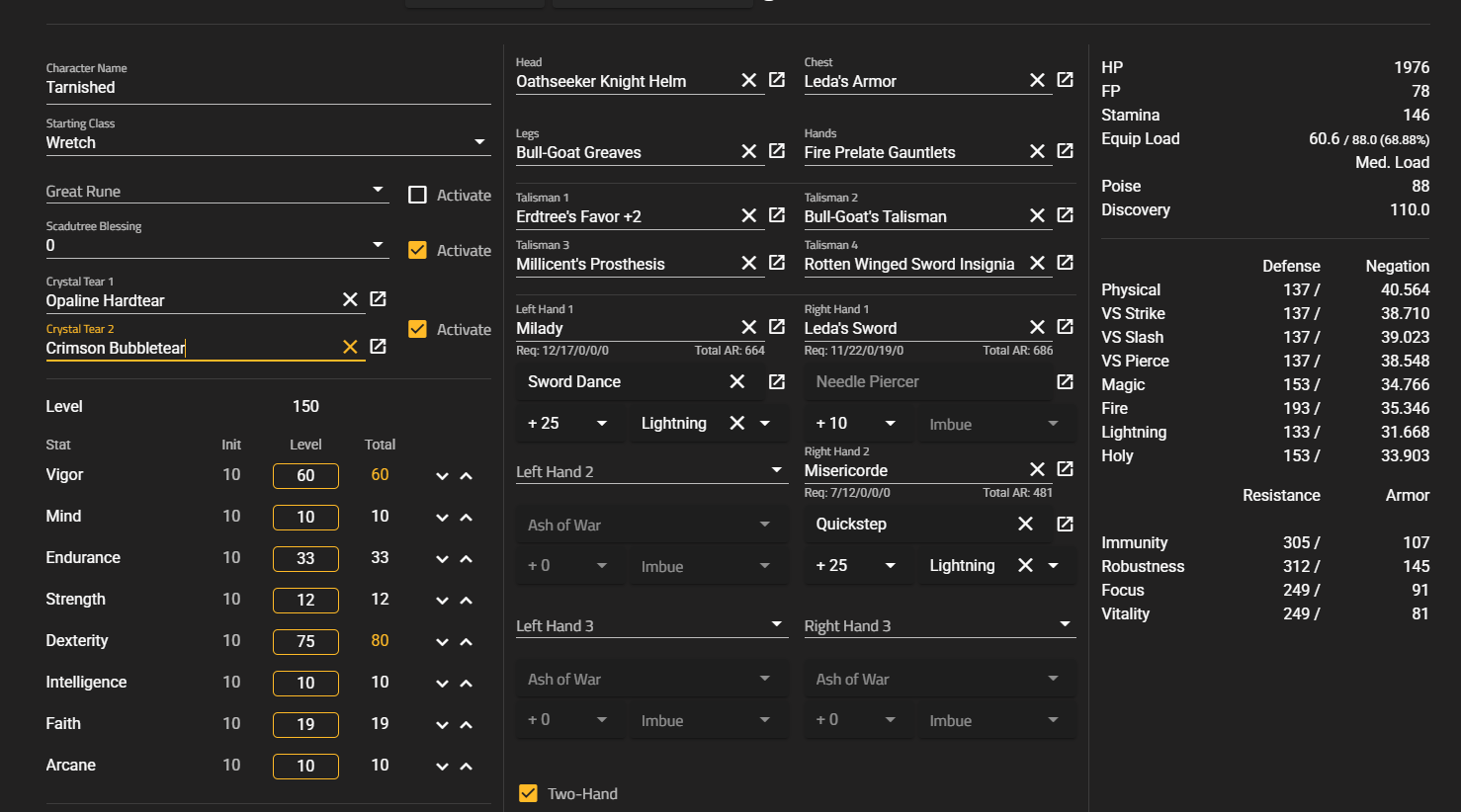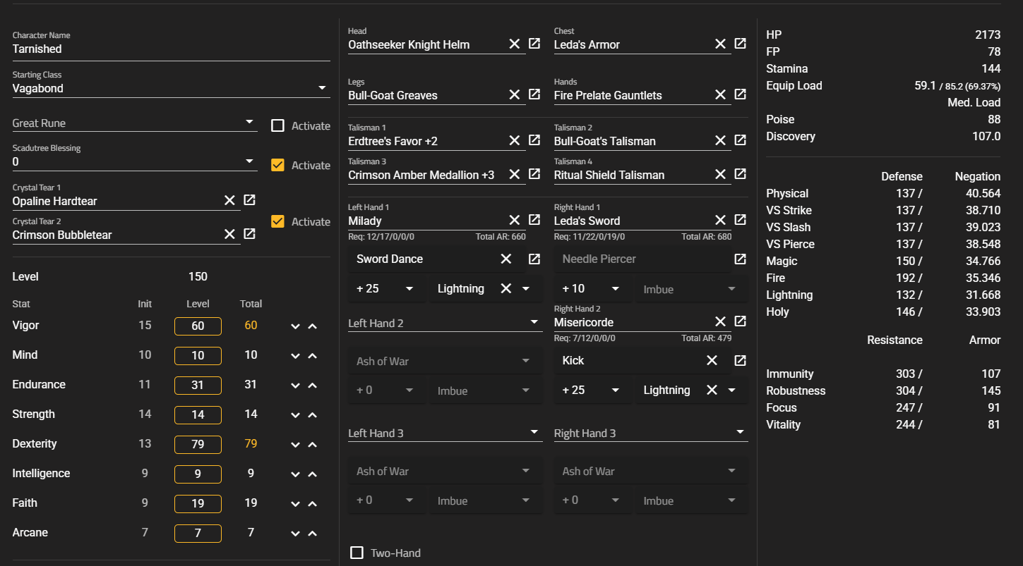 ОП и те кто катить собираются далее, добавьте более крутой калькулятор для персонажа. В нём намного больше инфы в билдостроении. https://er-inventory.nyasu.business/