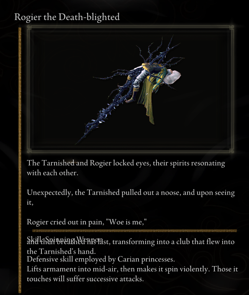 >>50681305 Так я говорю за статусный эффект, который можно накопить как через молитвы так и дефолтным оружием с кровотеком и прахами войны. А так на НГ+ его без труда можно заспамить спецатакой его же копья при билде через аркану