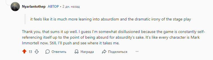 >>50661559 Ну, так и я говорю, что хороший линче-гоголевский постмодерн - это: "Я понял... Но нихуя не понял". Боб реален? Реален. Вигвамы реальны? Реальны. Легче стало? Не стало, история всё равно про людские пороки, страхи, черничные пироги и стружку с лесопилок. Представьте, что у Гоголя Иван Яковлевич находит нос Ковалёва, и... по дороге к реке его встречает Глаз и Ухо, которые говорят ему, что нос нужно выкинуть, иначе за ним придёт "призрак шинели", в итоге мы убегаем от Медного Всадника, которого призрак шинели подослал. Всё, это не мистика. Это фэнтези. Нагромождение "СТРАННЕНЬКИХ ШТУЧЕК)))" Да ты в первом море сатанел от усталости, пока среди этих сраных модерновых недохрущёвок намотаешь сто кругов, чтобы магия начала двигаться. В начале - сцена в театре, затравочка из червя возле пруда и трагика с исполнителем, а дальше - часы и часы бытовухи в степном городке. Когда ты встречаешь в итоге Альбиноса (за Гаруспика - Пророка) ты прямо ёрзаешь - ни нихуя се, тут вон чего в этом мире существует. А тут нахуя этот демон по крышам скачет? Вы ёбнулись? Дыбовский прямо на лекции говорил: "Я уважаю Сайлент-хилл, но идея просто добавлять в игру чудовищ-зомби и говорить, что это метафоры таких-то явлений, чувств и процессов - это уже пройденный этап сторителлинга, Сайлент Хилл эту тему закрыл". И нате, блядь, я должен поверить, что скайримовский огненный атронах с зелёной текстурой, который хватает меня за грудки рядом с цветком в духе Резидент Ивелов и прочих сай-фай хорроров - это "наверное, привиделось, наверное, метафора". Лучше бы мне релиз Патологика 3 привиделся. Метафора май эсс, Александра Голубева.