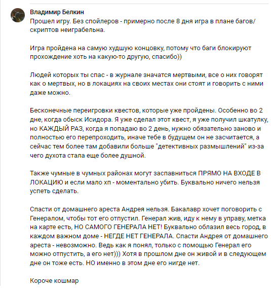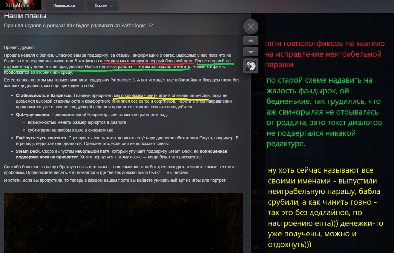 Паталогия 3 чисто по классике "у семи нянек дитя без глазу" - понабрали каких-то упырей по эмиграционной тюрьме или общаге и насочиняли хуеты. Диалоги - утомительная параша, можно было лаконичней, геймплей - унылый дроч костров и мусорок, повествование - рваное как жопы бэкеров. Отдельно проиграл с шабнак, показанной в лоб. В оригинале зло, с которым сражается игрок, не имело оболочки. А тут нате, байтите ее на костры, ебать шайкины рты.