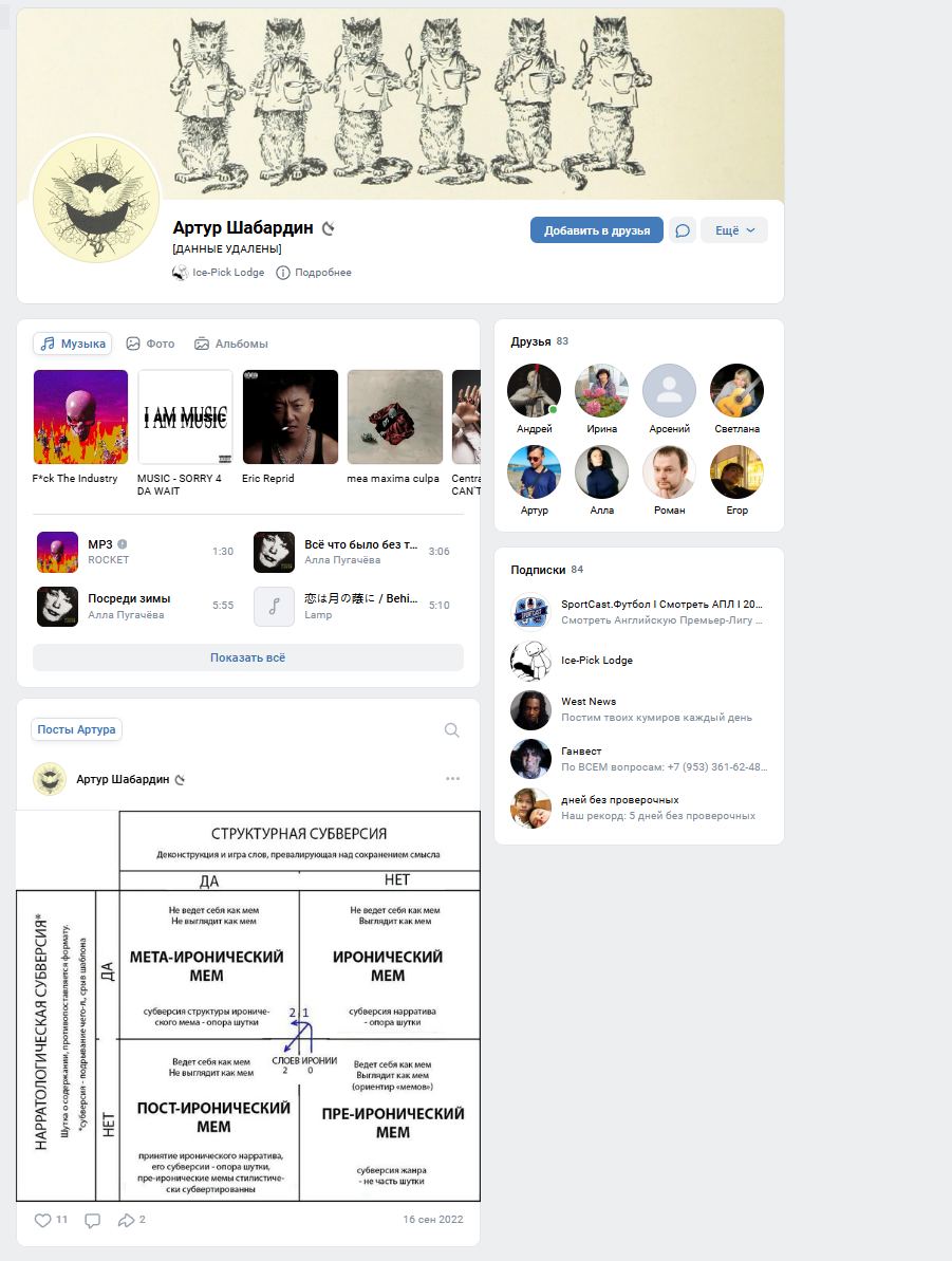 >>50680586 Обычно быдло типа >>50680509 изначально этически и эстетически на стороне кабанычей-уравнителей. И на твоей пример с Твин Пиксом, с которым я целиком солидарен, оно может ответить (или промолчать, но подумать): "Да, и второй сезон был тоже хорошим, а вот в третьем шизу-деду дали свободу и он вышел говном!" (хотя третий сезон Твин Пикса - это величайшее произведение Линча). Тут надо до конца раскручивать спираль понимания собеседника. Может статься, что ему действительно нравится прилизанный кабанчиком кал, а реально творческие проекты вызывают у него изжогу и лучше бы их не было вовсе.