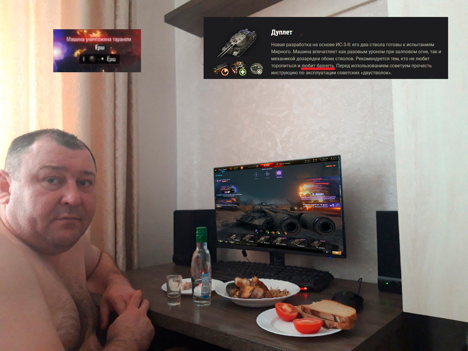 Каталси на рокете, и тут с горки шариотр выезжает, бесстрашно выстааляя ебало, и ловит две рокеты, я еще крякнул с этих 1к халявных, потом смотрю в стату, а там синьор дегенерат красный с 12к боев. Он даже не вдуплил, что произошло, похоже