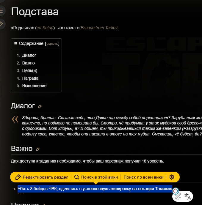 >>50678229 я когда Тур проходил реально пошел на Лабу как в описании в игре сказано, а там прям в игре подзадачи обновились типа походи там, походи сям, да еще выйди через водосток, иначе хуй тебе а не завершение квеста. Случайно получилось что я просто сам побродил везде и вышел через водосток тк выход безопасный, только потом узнал что это всё еще и по квесту надо сделать было. А то ебать охуел бы если бы не повезло. Конечно не в лом побегать лишний раз куда и так пойдешь снова, но бля, без вики в Тарков играть вообще запрещается.