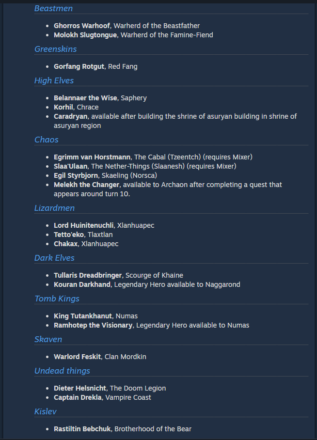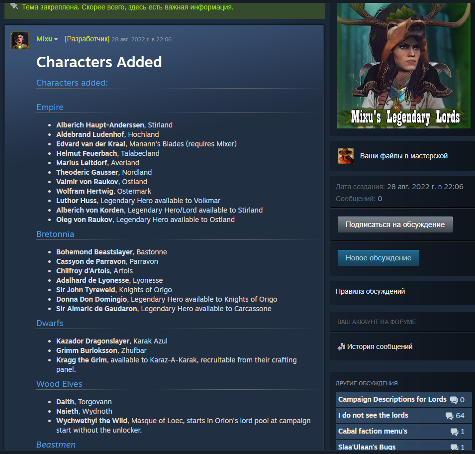 >>50691695 Одна из самых первых (еще в двухе появилась) глобальных васянок с новыми фракциями, которые добавляли лорных персонажей в игру на место минорных фракций. Это не перебаланс как СФО это именно новые фракции с лордами и своими микромеханиками (типа в Талабекланде есть культ Таала, а в Остермарке можно огров нанимать через лэндмарку). Типа добавляют именных лордов на фракции курфюрстов Империи и Бретонии и еще паре рас https://steamcommunity.com/workshop/filedetails/discussion/2802810577/3317484899042968859/