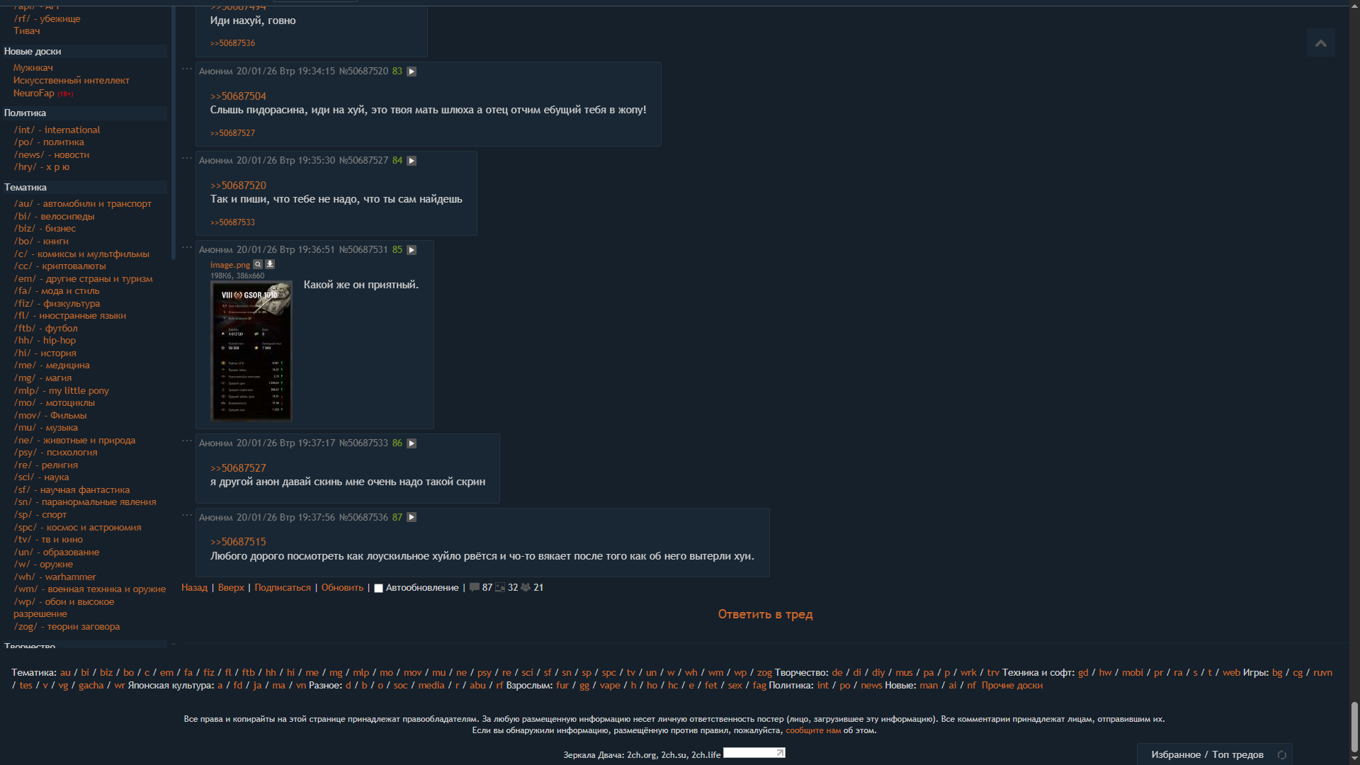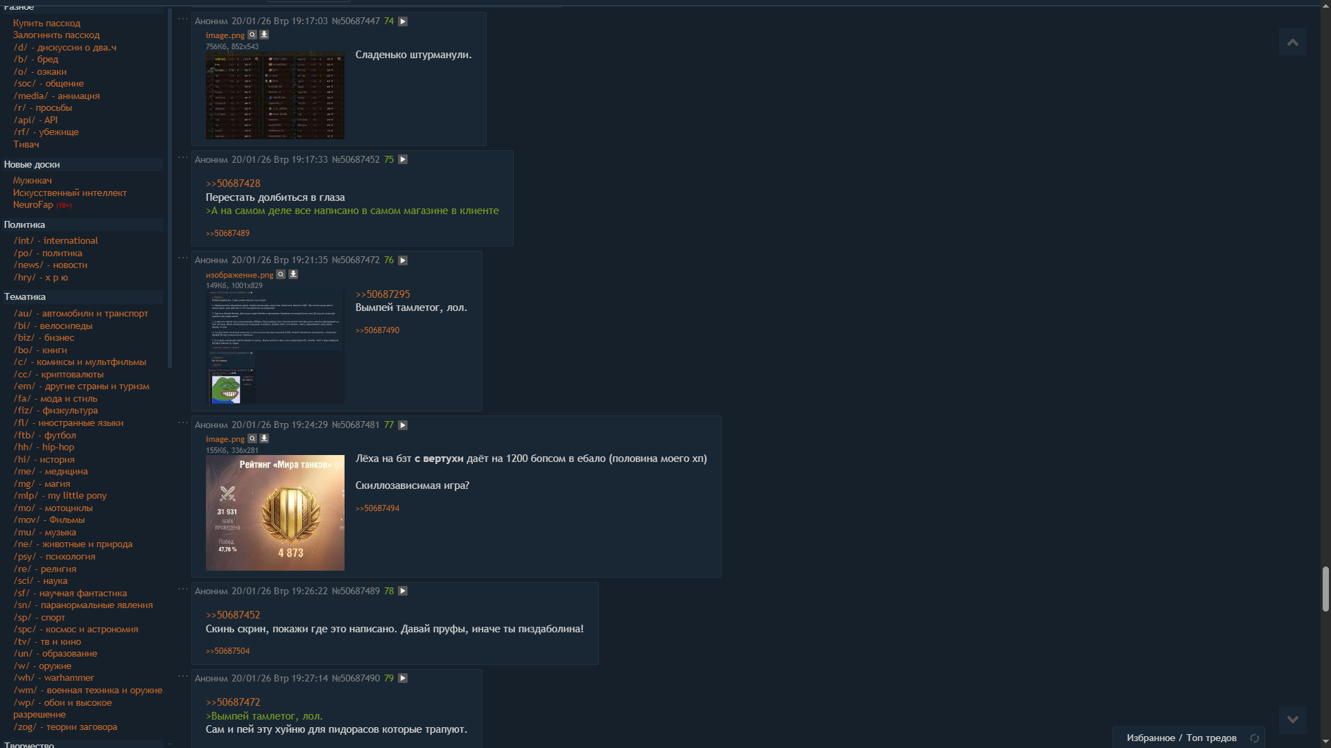 >>50691251 Я вообще другой анон. >>50691253 >А че за сопля? Просвети пожалуйста для новенького, чем знаменит гражданин этот. Зеленая сопля, агрессивный дурачок требующий у обоссавшего его анона статистику. Когда статистика появляется срывается на визг что статистика не статистика, давай видео, давай фидео на фоне паспорта, это не твоя статистика это буст и так до бесконечности. Его манямирок непрошибаем. Собсна из за таких как он танкистов и считают тупорылым скотом. >>50691256 >от двух тысяч боёв Маловато будет. Пока нет 10к боев на технике есть шанс что это буст.